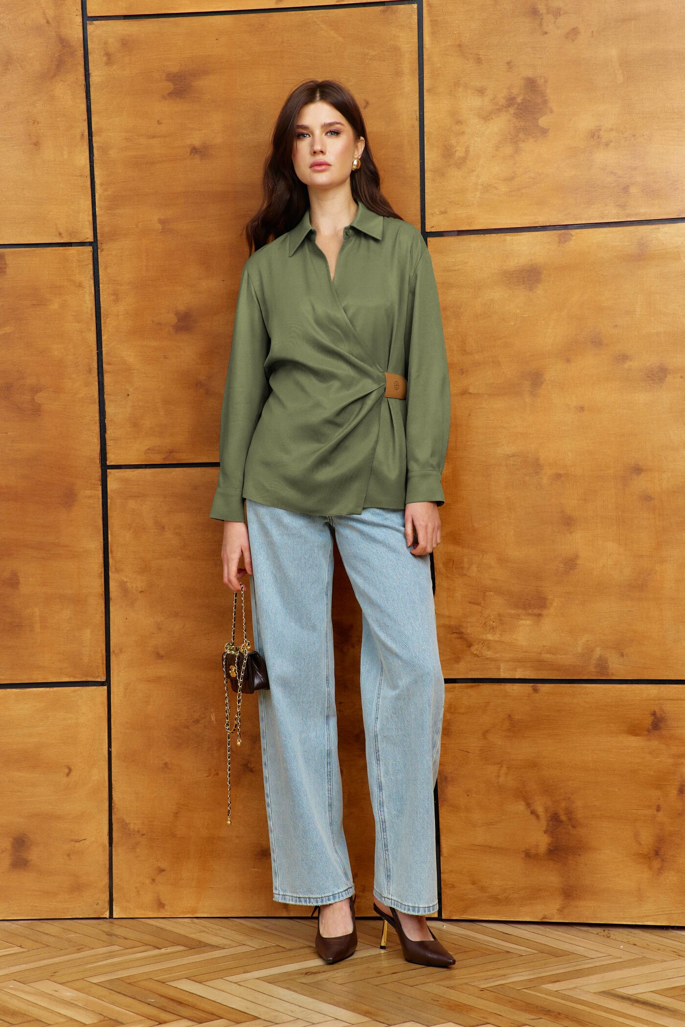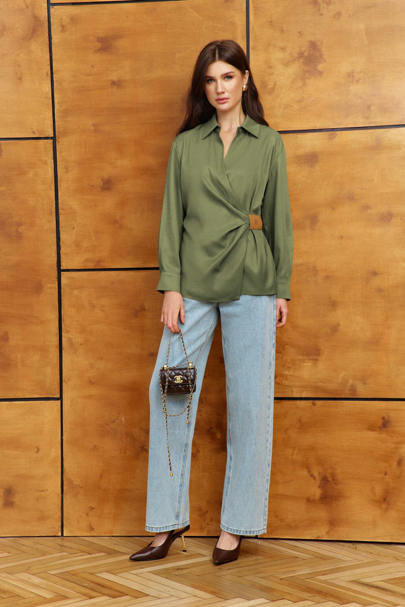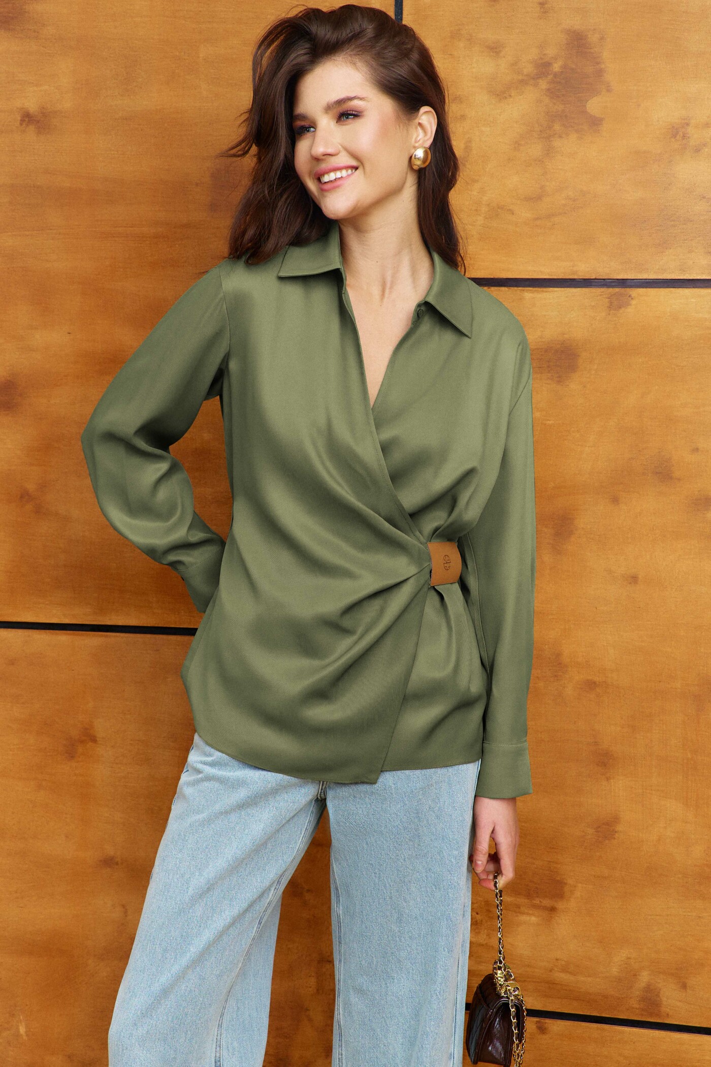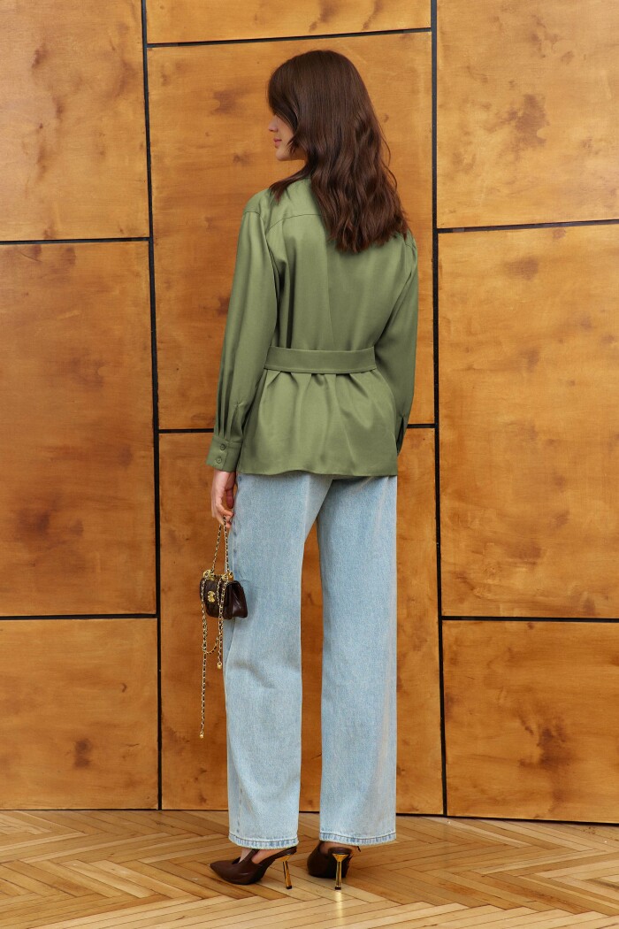 Блузка выполнена из вискозного полотна. Модель прямого силуэта. Горловина с отложным воротником на стойке. Спереди V-образный асимметричный запах со складками, фиксирующийся на завязывающейся хлястик на талии через кулису, которая оформлена фирменной нашивкой. По спинке две складки, направленные от кокетки. Рукава втачные, длинные, со складками вдоль застёгивающейся манжеты. Длина изделия 67 см, длина рукава 58,5 см.