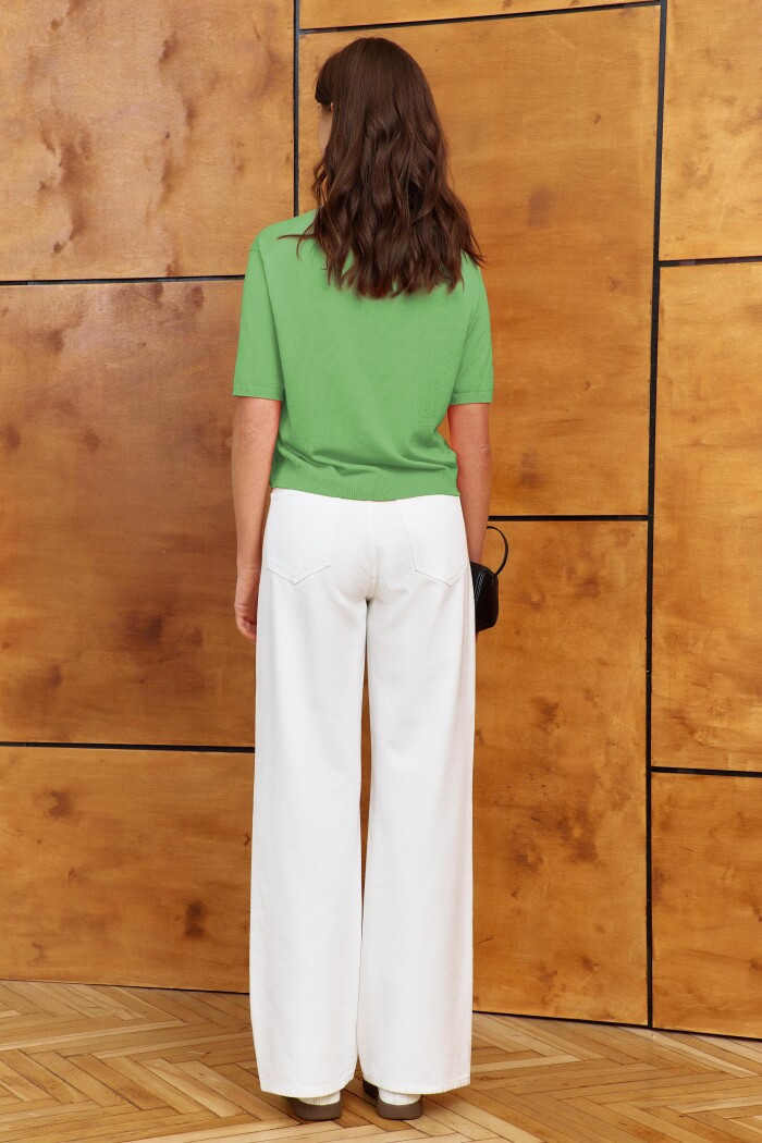 Джемпер вязаный полуприлегающего силуэта вязки "лицевая гладь". Модель длиной выше линии бедер. Круглый вырез горловины. Укороченный рукав. Низ изделия и рукава оформлен манжетой. Базовая модель, подойдет к любому типу гардероба. Длина изделия 53 см; длина рукава 26 см.