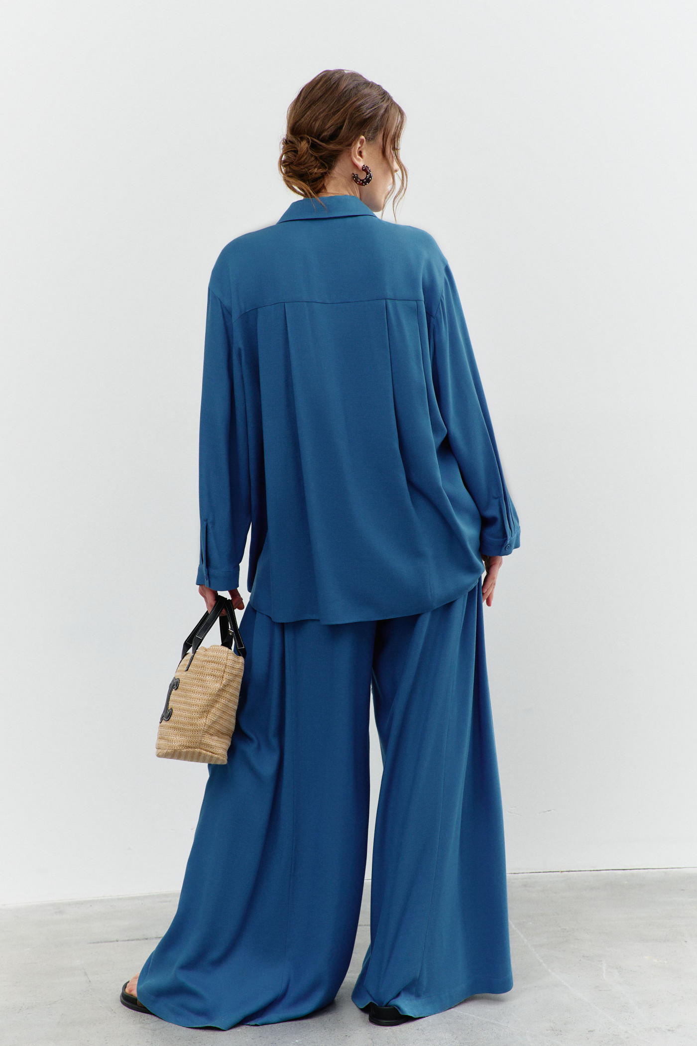 Широкие брюки-палаццо выполнены из хлопкового полотна. Модель полуприлегающего силуэта с комфортной высокой посадкой, на притачном поясе с эластичной тесьмой между слоями. Особым декоративным элементом являются широкие вставки (присборенными по верхнему срезу) по боковым швам и с притачными застёгивающимися патами на петлю и декоративную пуговицу. Для удобства в носке предусмотрены спереди карманы в швах. Длина изделия (с поясом) 114 см.