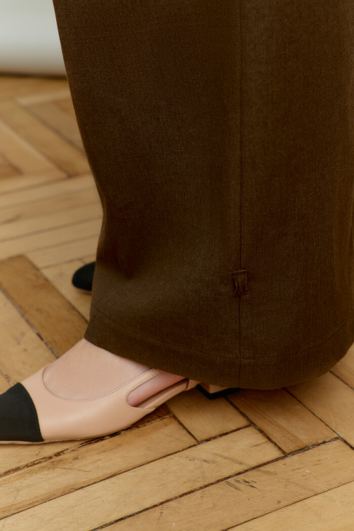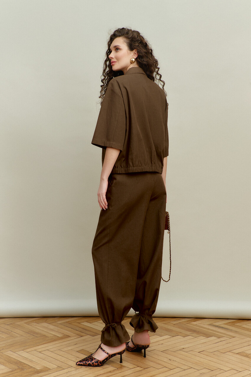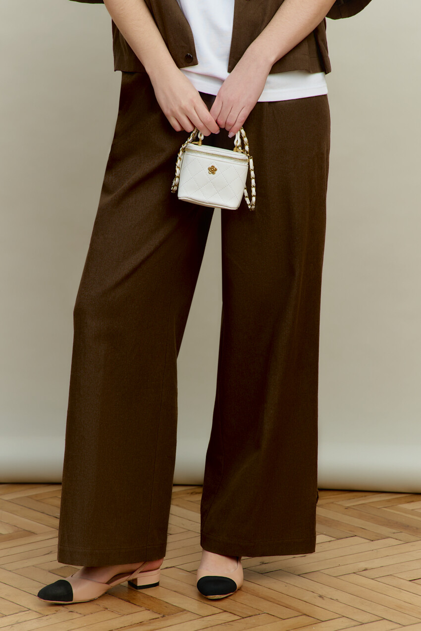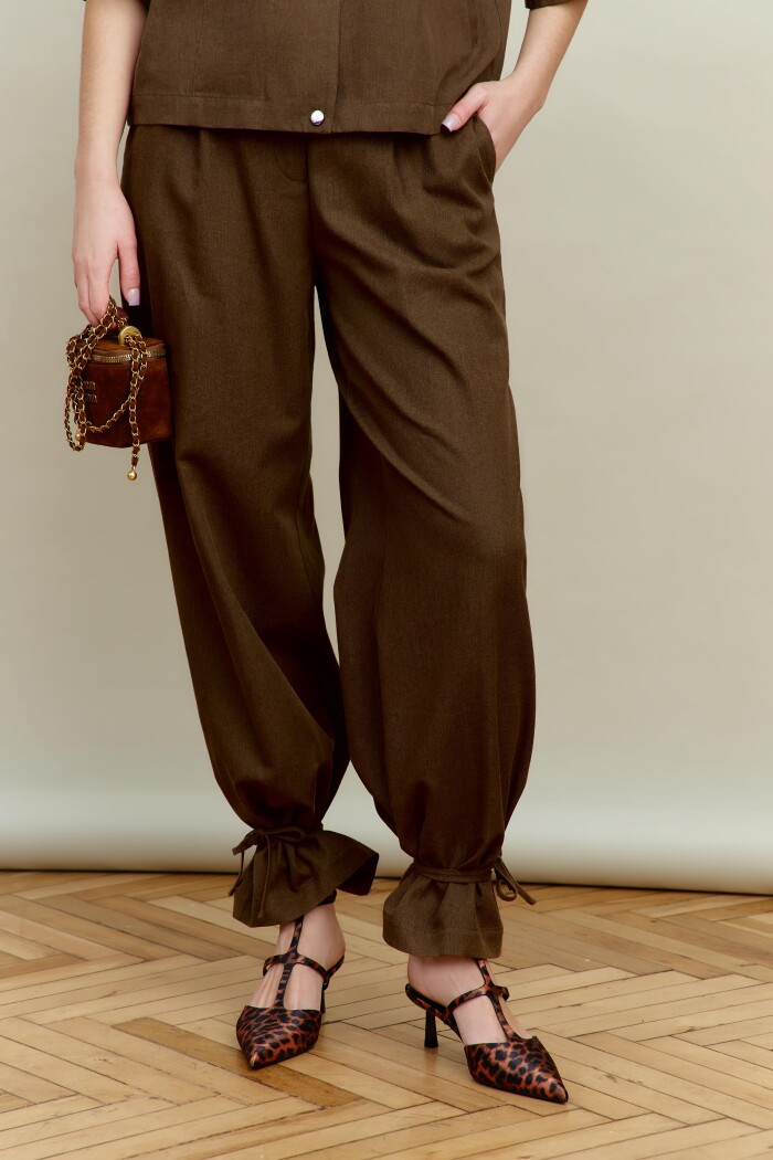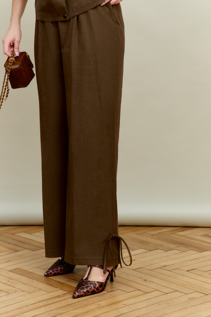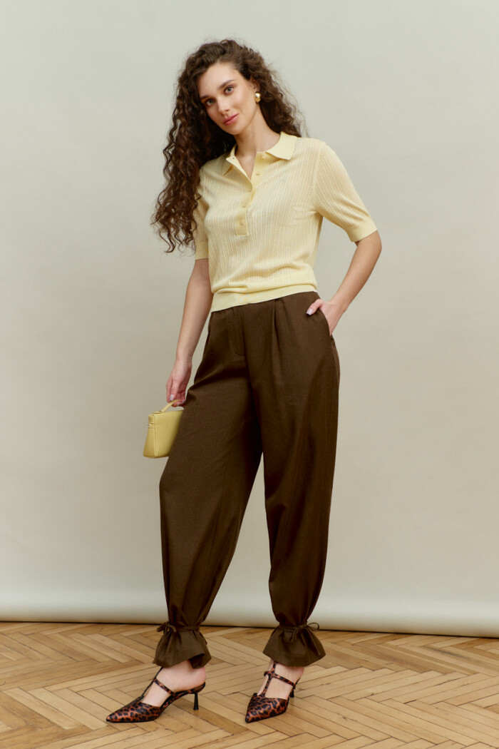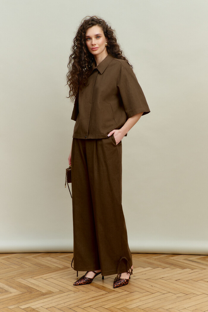 Элегантные брюки выполнены из костюмного хлопкового полотна с добавлением льна. Модель с комфортной средней посадкой, на притачном поясе и эластичной ленте по спинке, застёгивающимися на потайной брючный крючок. Спереди заложены складки, в боковых швах выполнены функциональные карманы «в швах» и застёжка на тесьму «молния». В качестве декора на боковых швах (снизу) настрочена шлёвка и протянут шнур-завязка из основного полотна. Длина изделия (с поясом) — 109 см.