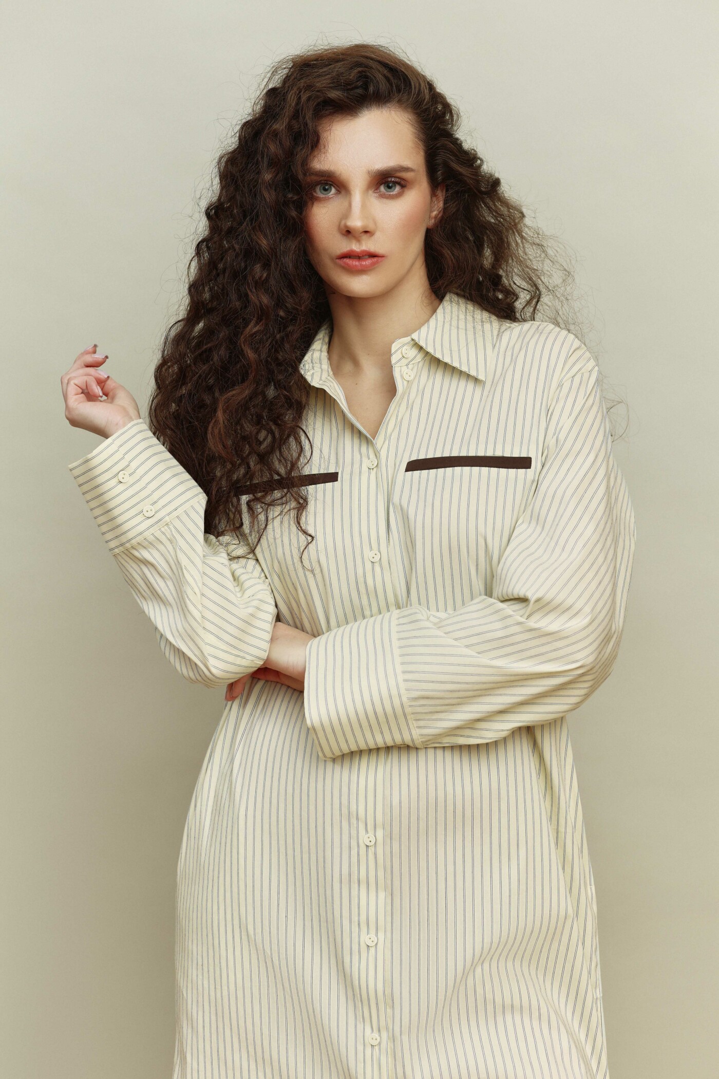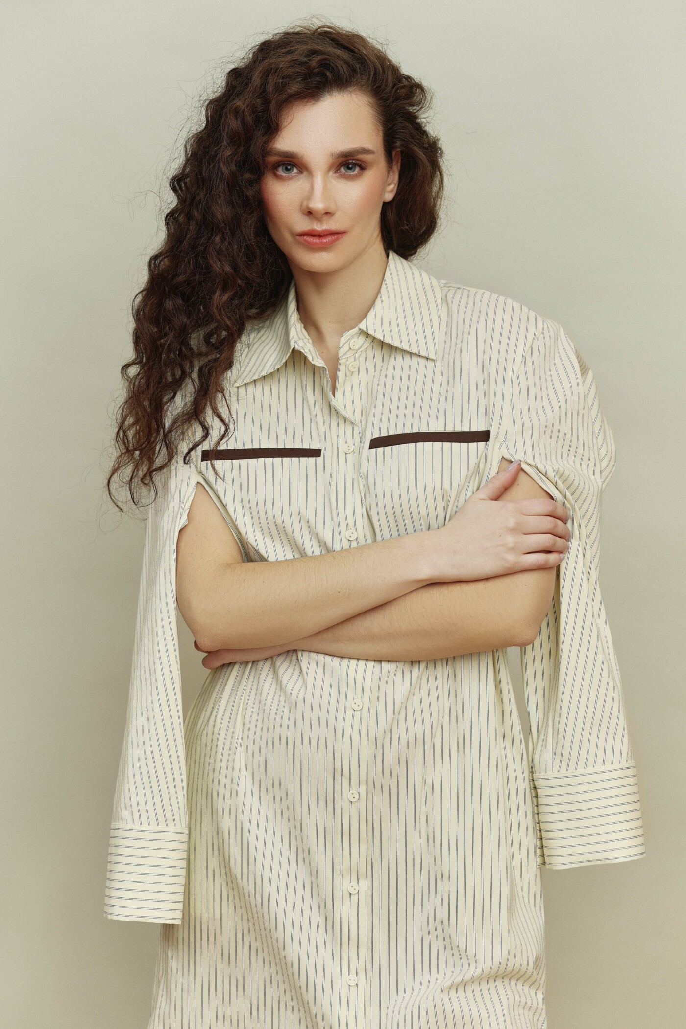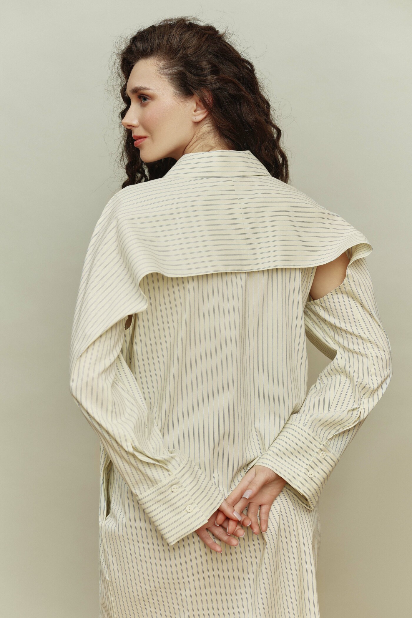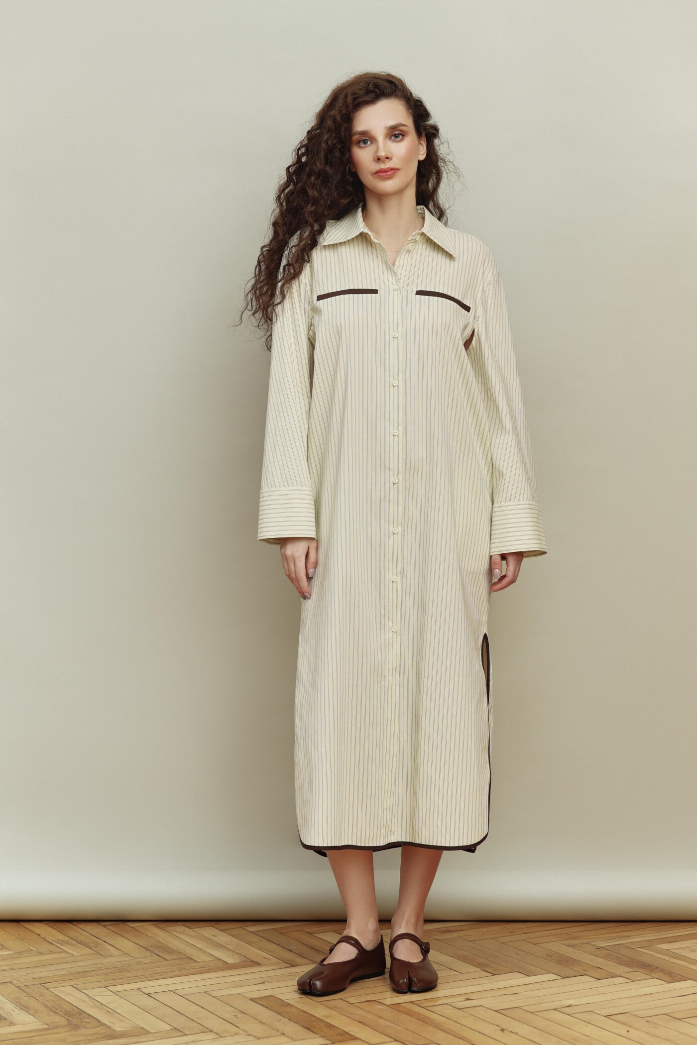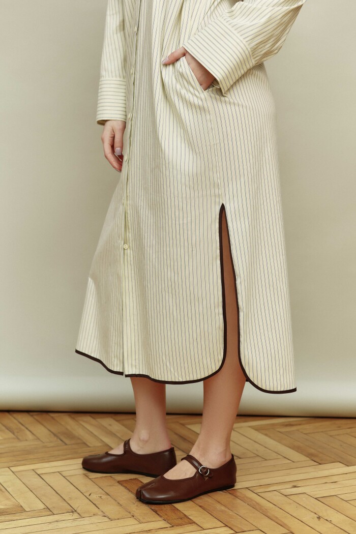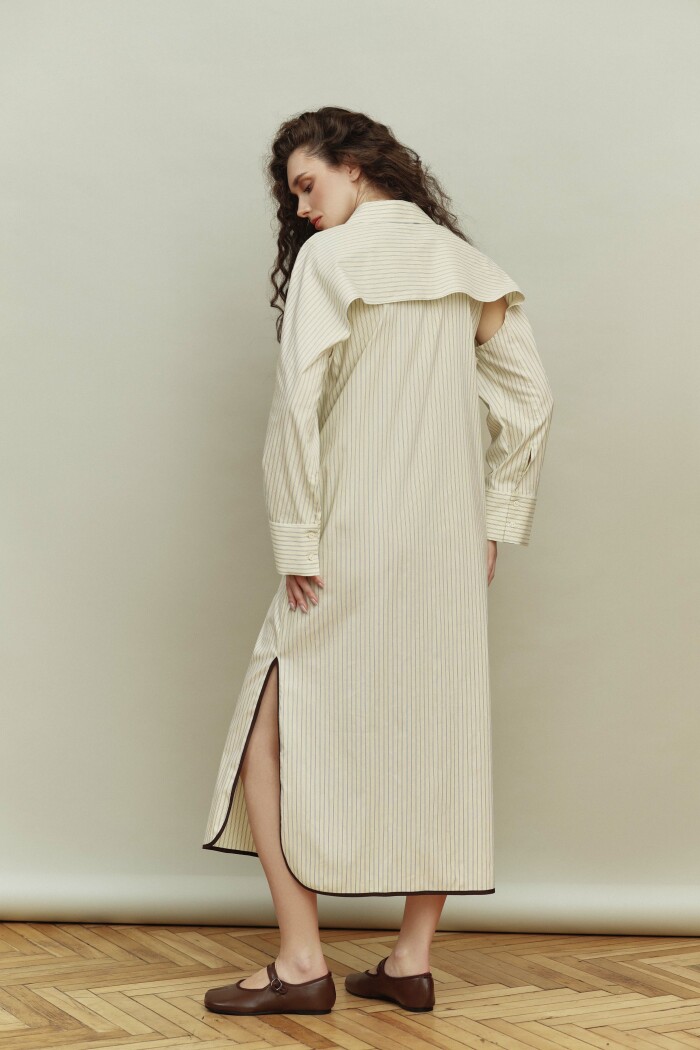 Платье-рубашка в стиле smart casual выполнено из хлопкового полотна в полоску. Модель прямого силуэта со спущенной линией плеча. Воротник отложной на стойке. Для удобства в носке в боковых швах предусмотрены карманы, а в качестве декора на деталях переда (выше уровня линии груди) выполнены нефункциональные прорезные карманы с листочкой из контрастного отделочного полотна. По центру переда — цельнокроеная планка на петли и декоративные пуговицы. Особым декоративным элементом являются комбинированные двухшовные рукава, частично отлетные по пройме (со стороны спинки) и переходящие в отлетную кокетку по спинке. Низ рукава оформлен застёгивающейся манжетой на петли и декоративные пуговицы, а низ платья — с фигурными разрезами, которые окантованы отделочным полотном. Длина изделия — 127 см; длина рукава (от горловины) — 75,5 см.
