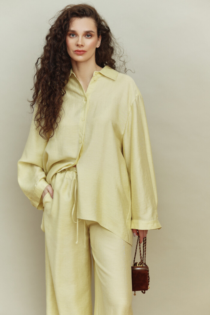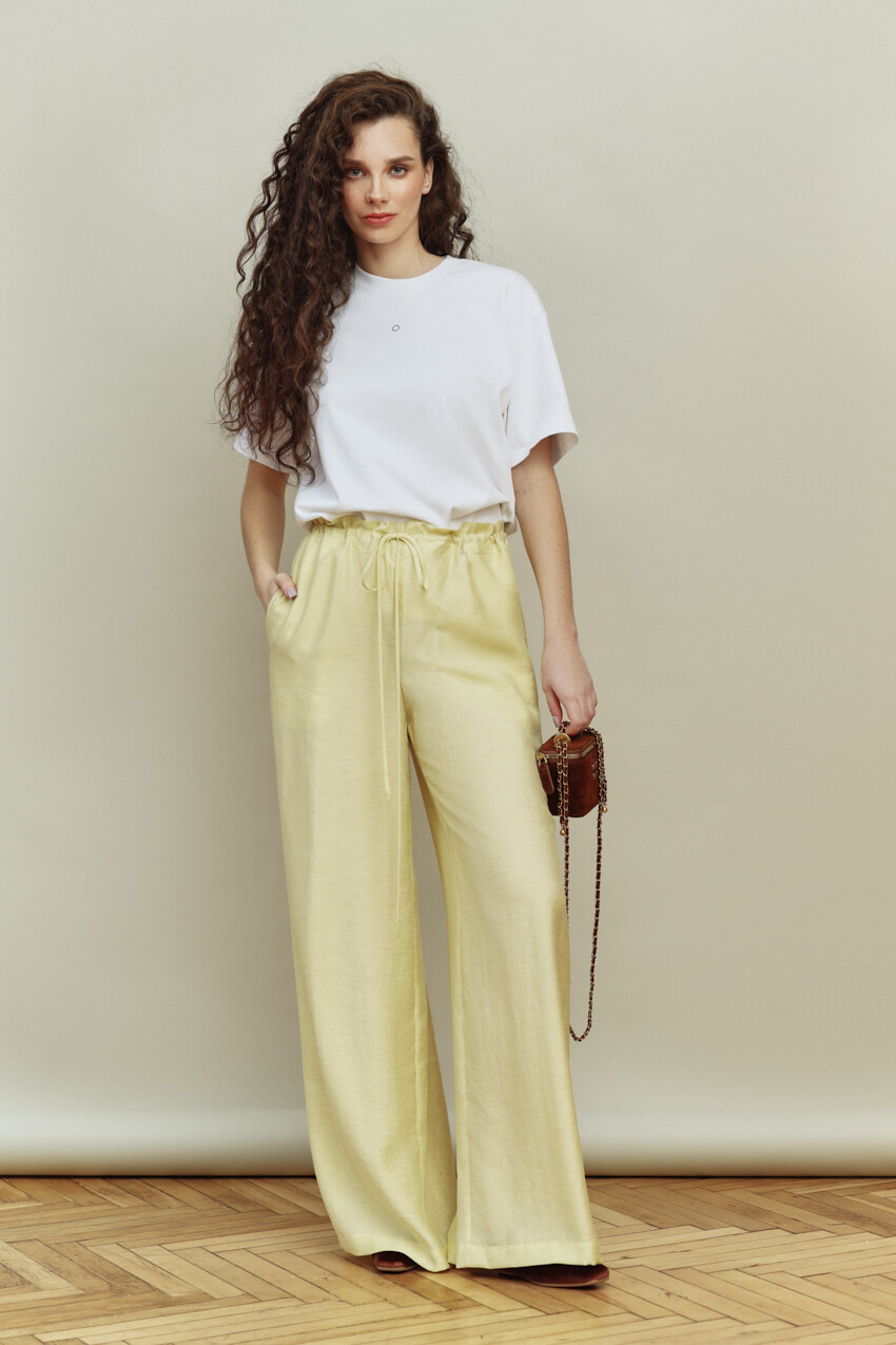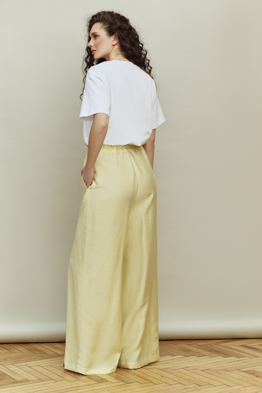 Широкие брюки-палаццо выполнены из платьево-блузочного полотна с добавлением льна. Модель полуприлегающего силуэта с комфортной высокой посадкой, с цельнокроеным поясом и функциональным шнуром, из основного полотна протянутым между слоями. Для удобства в носке предусмотрены в боковых швах карманы. Длина изделия (с поясом) 111 см.