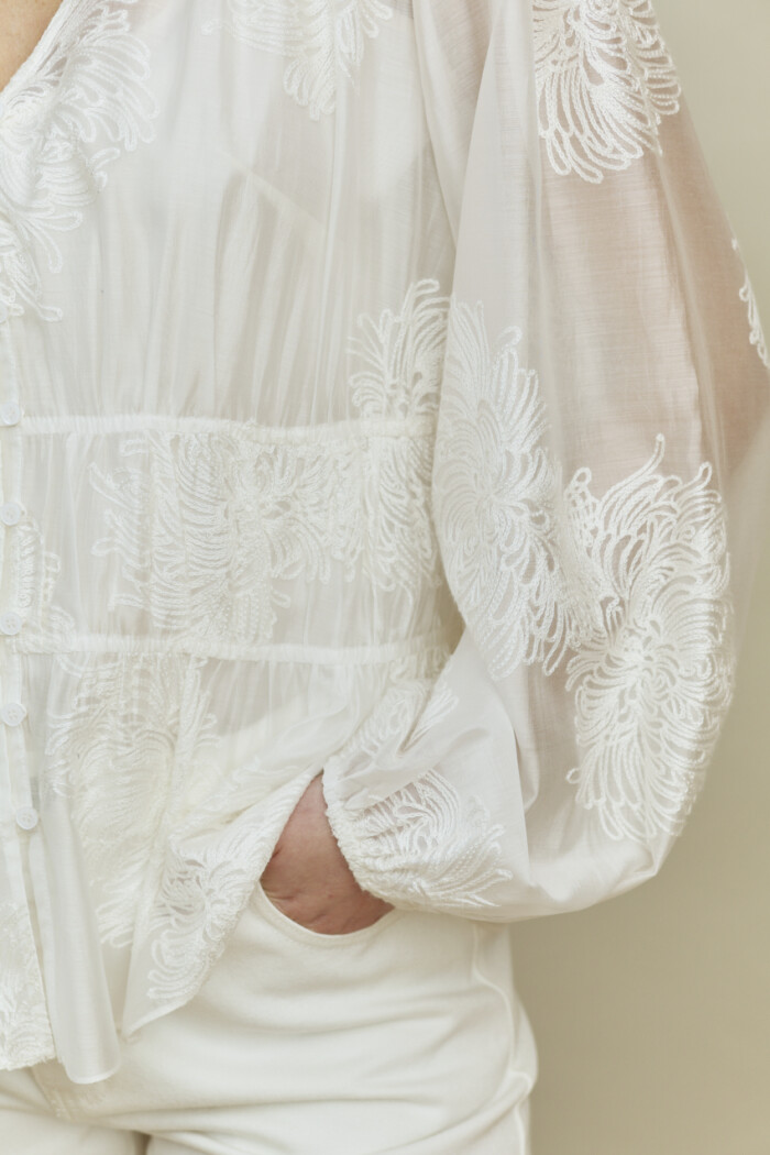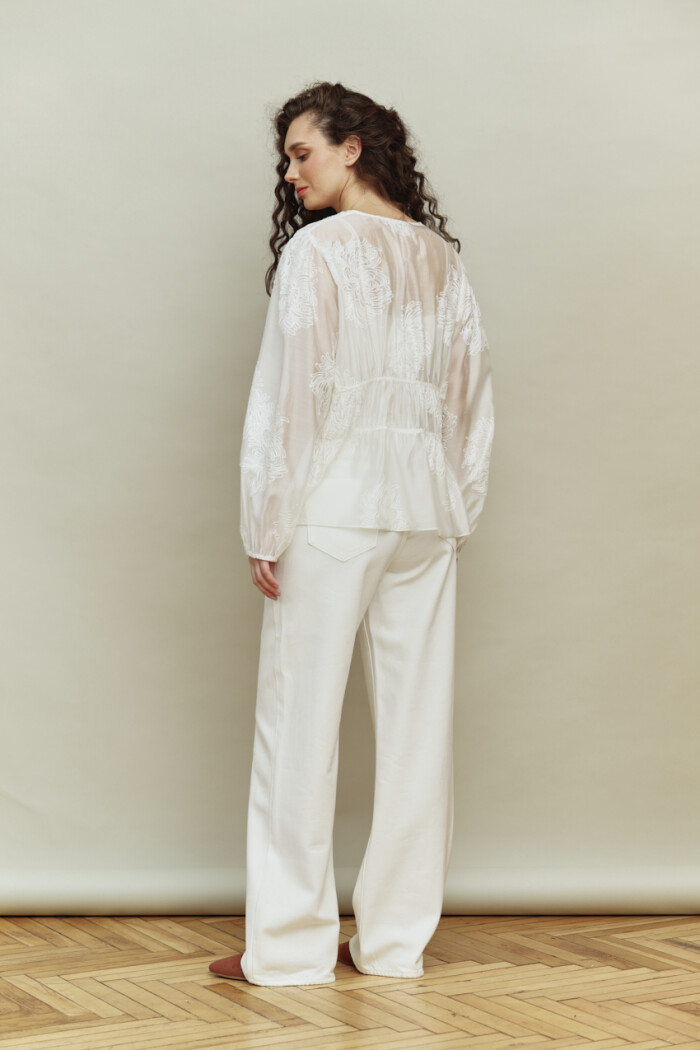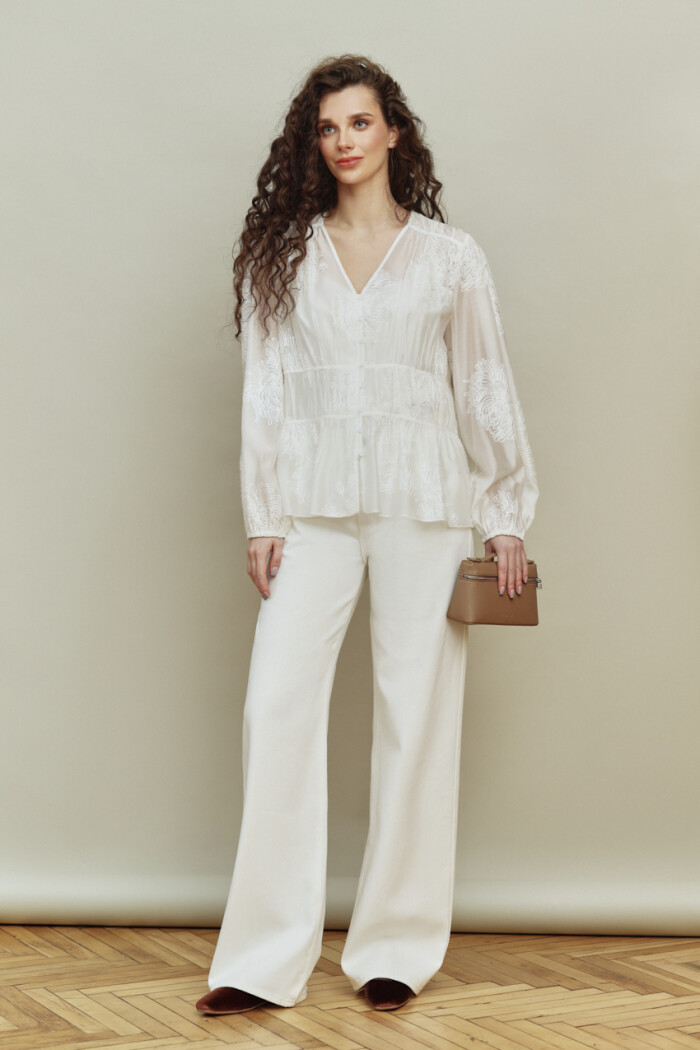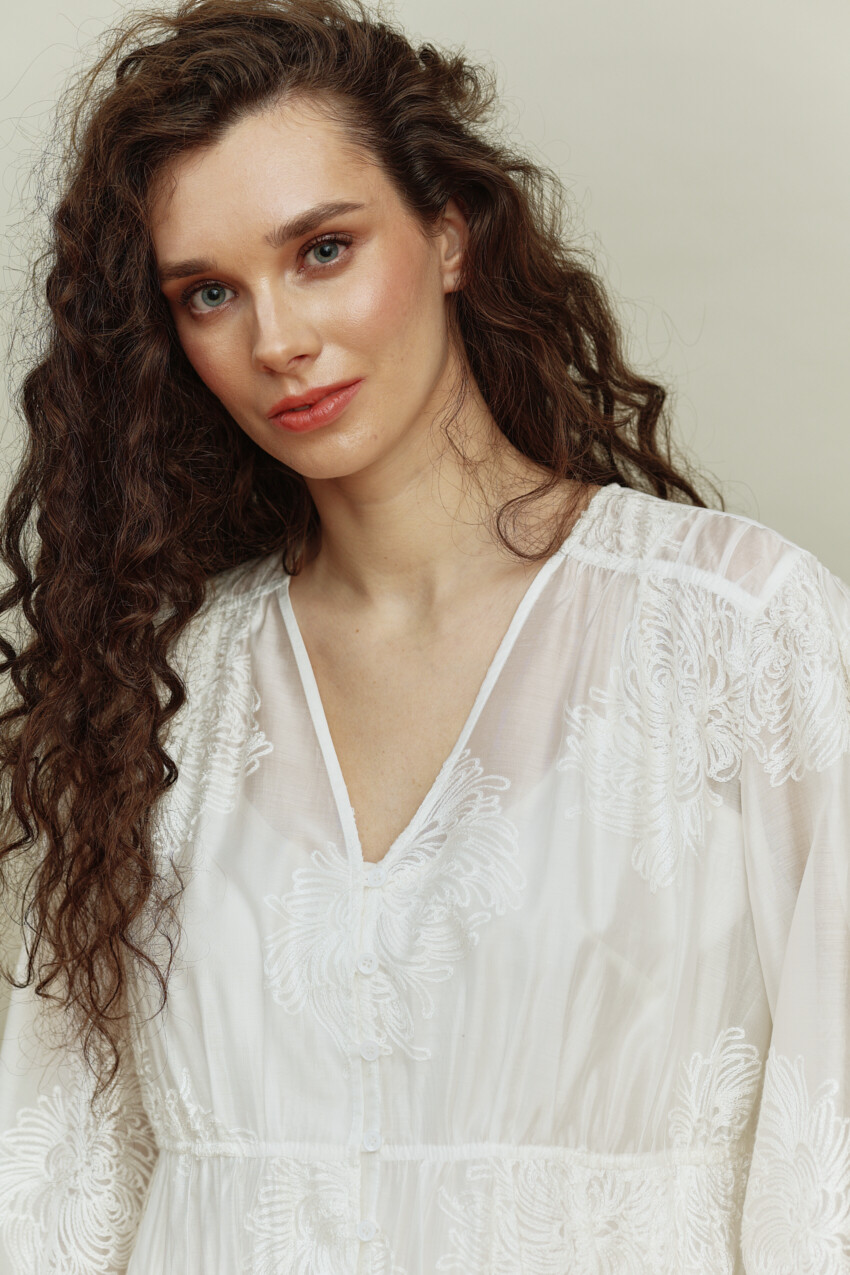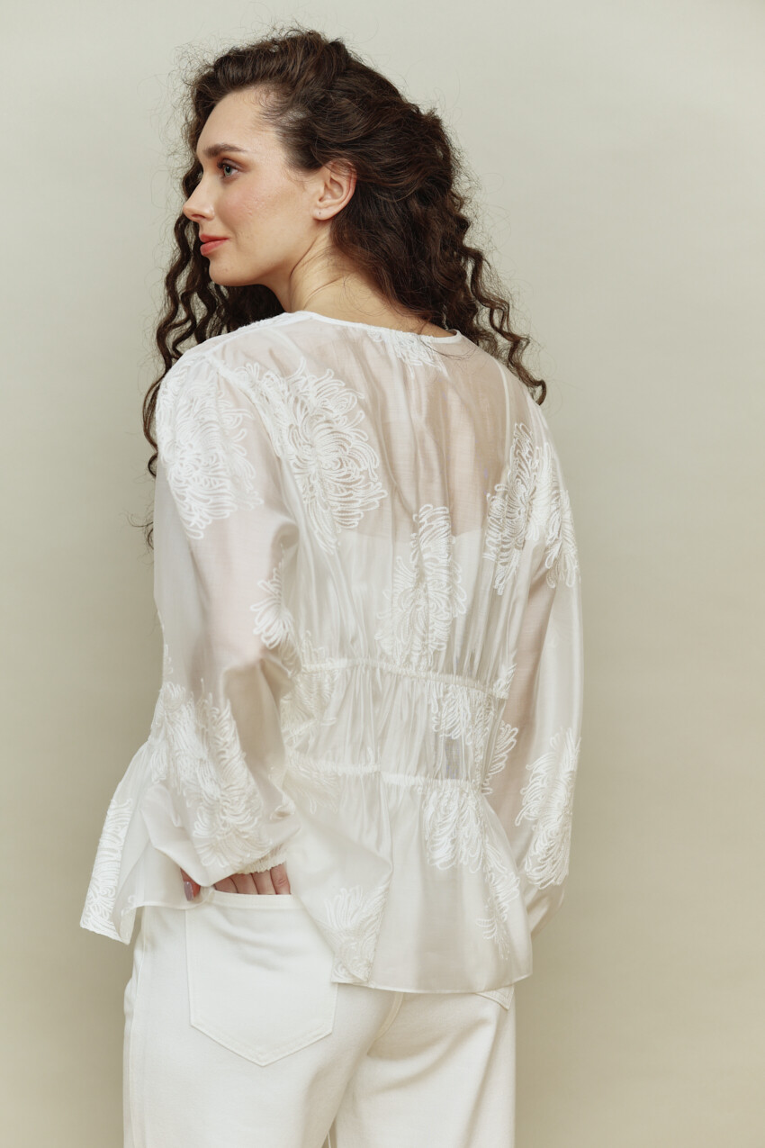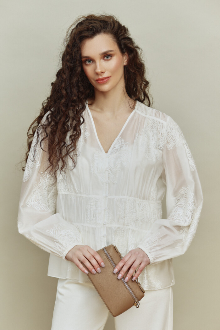Блузка в стиле city chic выполнена из полупрозрачной вуали с объёмной вышивкой. Модель прямого силуэта с V-образной горловиной. Кокетка переда с небольшой сборкой. На деталях переда и спинки выше линии талии и чуть ниже оформлены горизонтальные резы со сборкой. Для удобства в носке по переду расположена застёжка на навесные петли и декоративные пуговицы. Центр спинки оформлен с учётом сборки, направленной от горловины. Рукава длинные с эластичной лентой внизу, что позволяет регулировать их длину и лёгкую сборку по окату. Модель комплектуется топом из вискозного полотна на регулируемых по длине бретелях. Длина изделия 62 см, длина рукава 64 см.