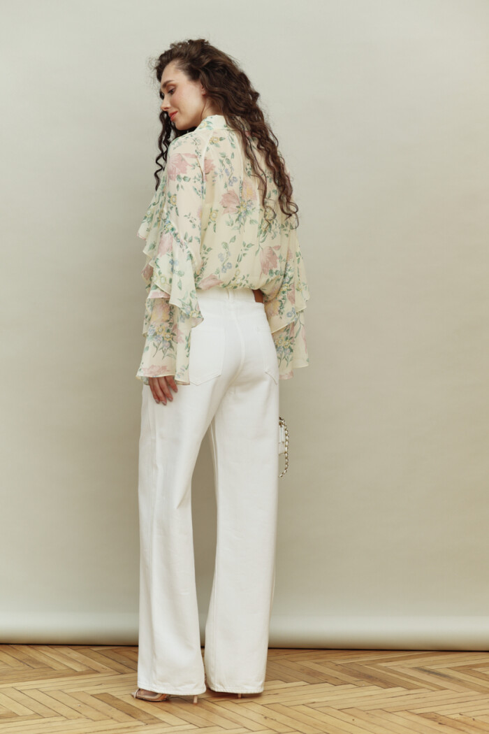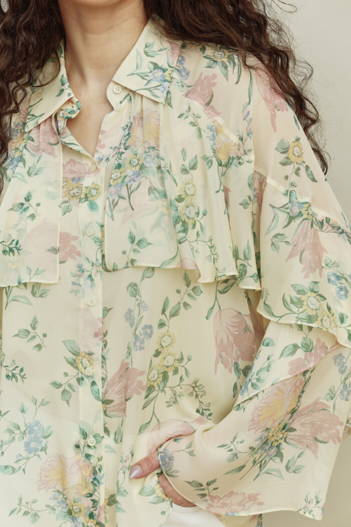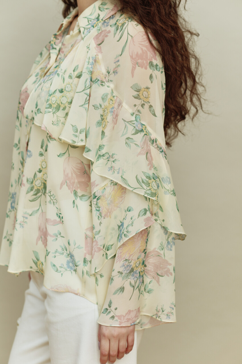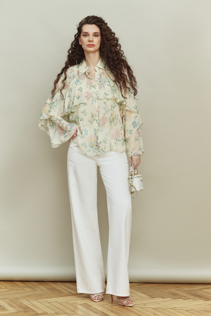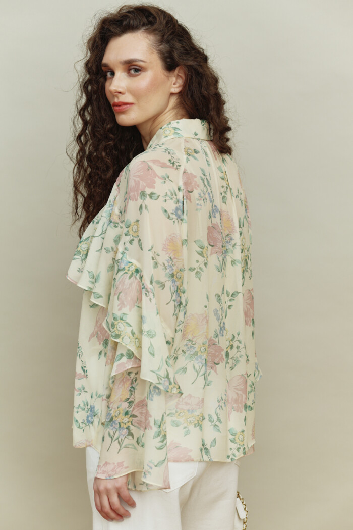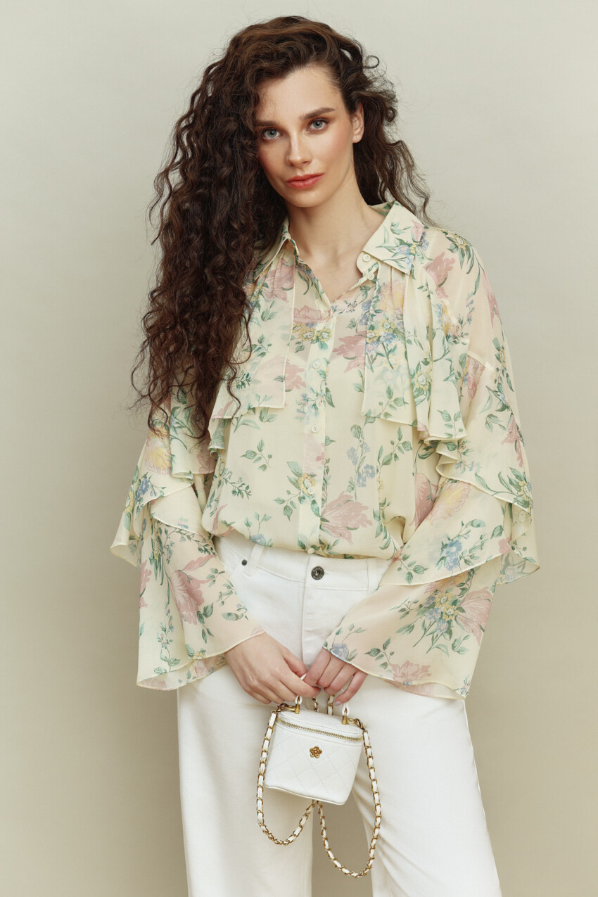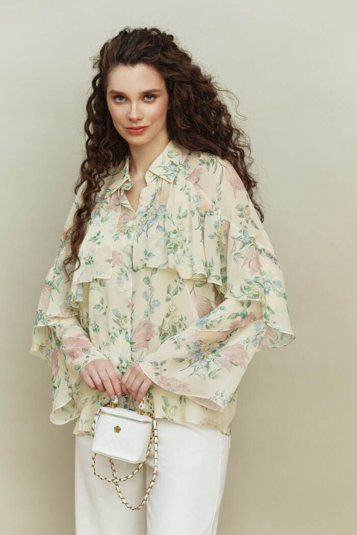 Блузка в стиле city chic выполнена из струящегося вискозного полотна с актуальным дизайнерским принтом. Модель свободного кроя. Воротник отложной на стойке. По горловине спинки и переда выполнена сборка. Спереди предусмотрена застёжка на петли и декоративные пуговицы. Длинные, расширенные рукава покроя реглан. Главной декоративной деталью является отлетной волан, который втачан в шов реглана по переду, плавно переходит в волан по задней части рукава и затем наперед, создавая объём и романтичный вид. Модель комплектуется топом из вискозного полотна на регулируемых по длине бретелях. Длина изделия 65 см; длина рукава (от горловины) 74 см.