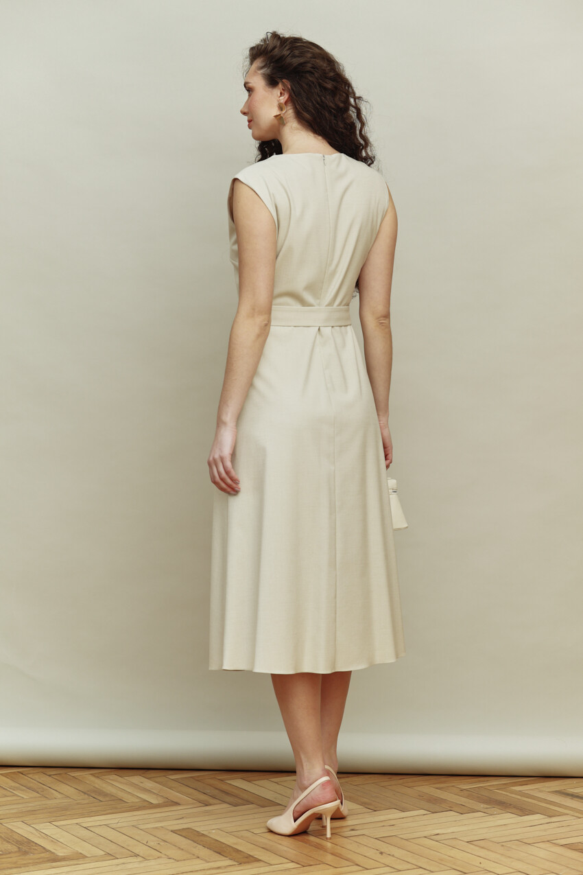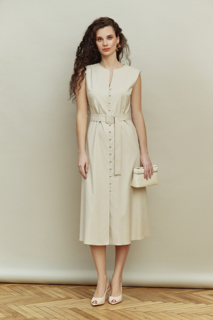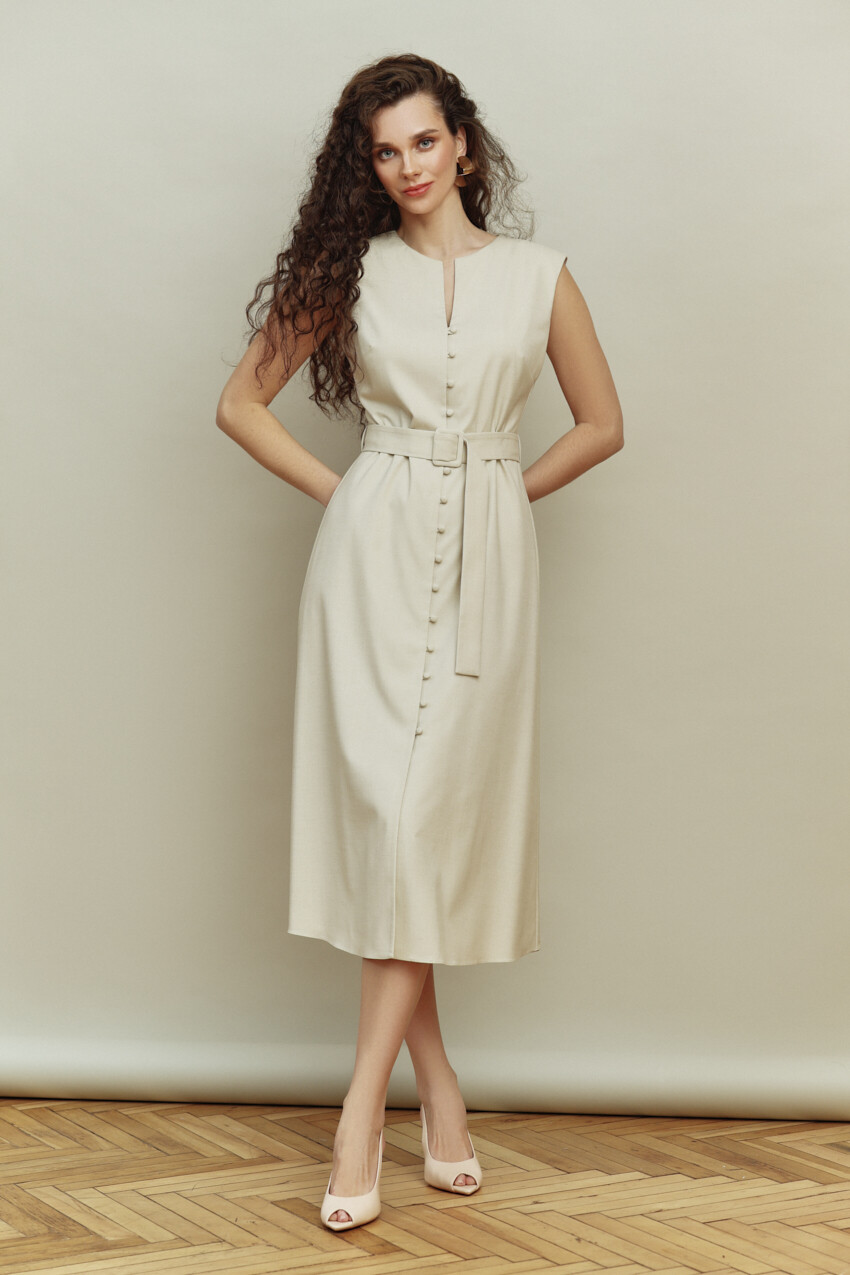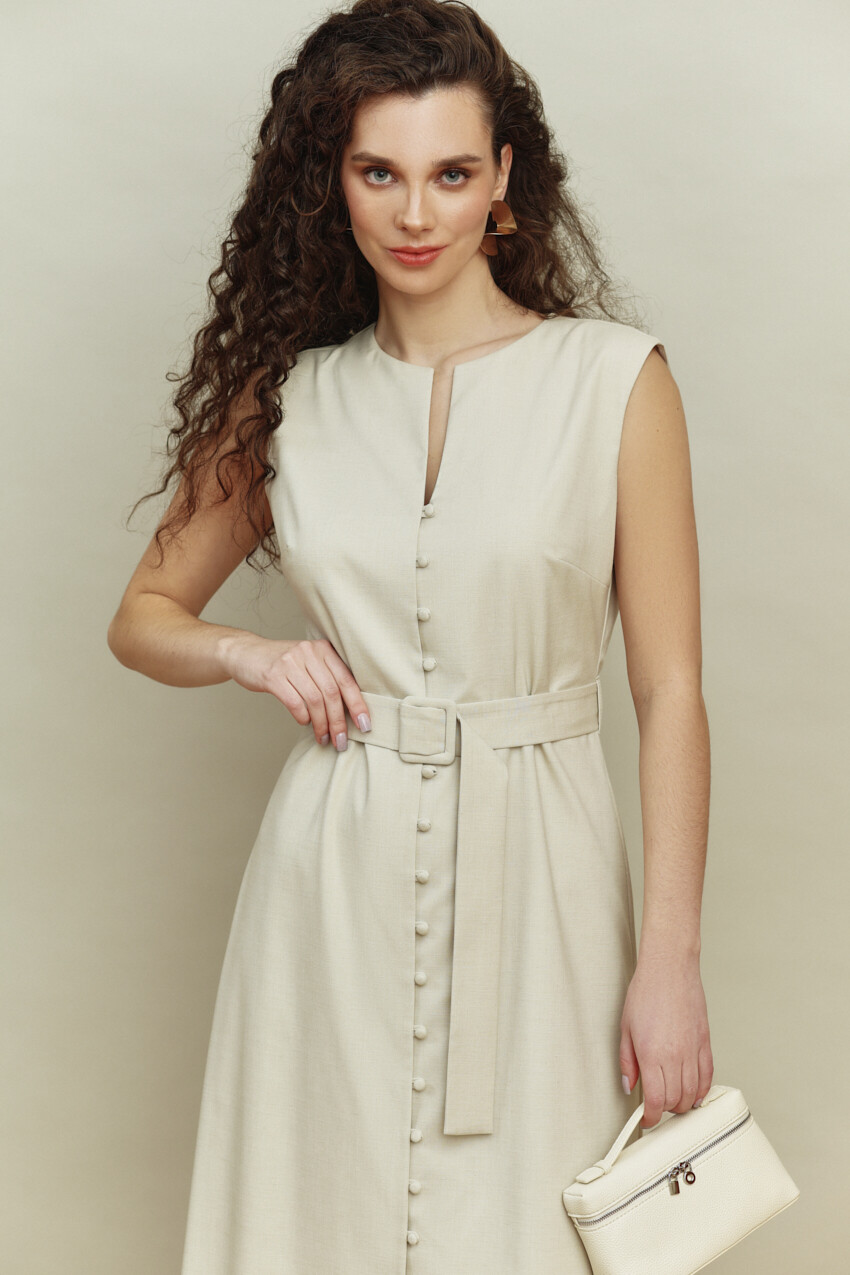Платье-сарафан в стиле city chic выполнено из костюмно-плательного полотна. Модель полуприлегающего силуэта с круглой горловиной. Особым декором служит застежка на обтяжные пуговицы и навесные петельки. Для удобства в носке в среднем шве спинки длинная потайная тесьма "молния". Комплектуется поясом с обтяжной пряжкой. Изделие подкладке из вискозного полотна. Длина изделия 119 см.