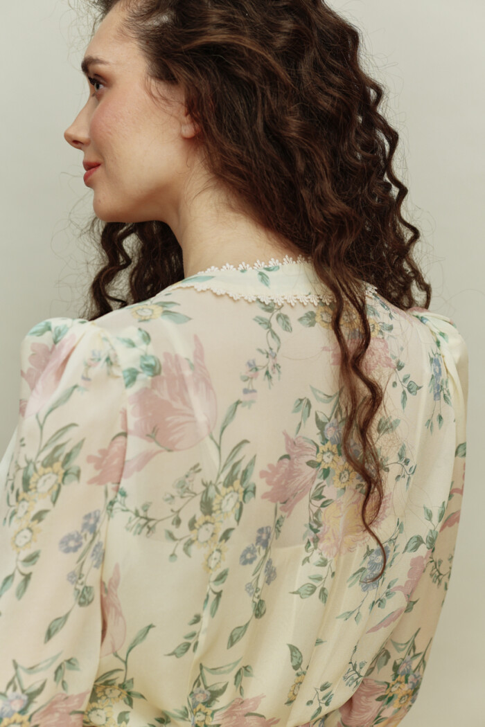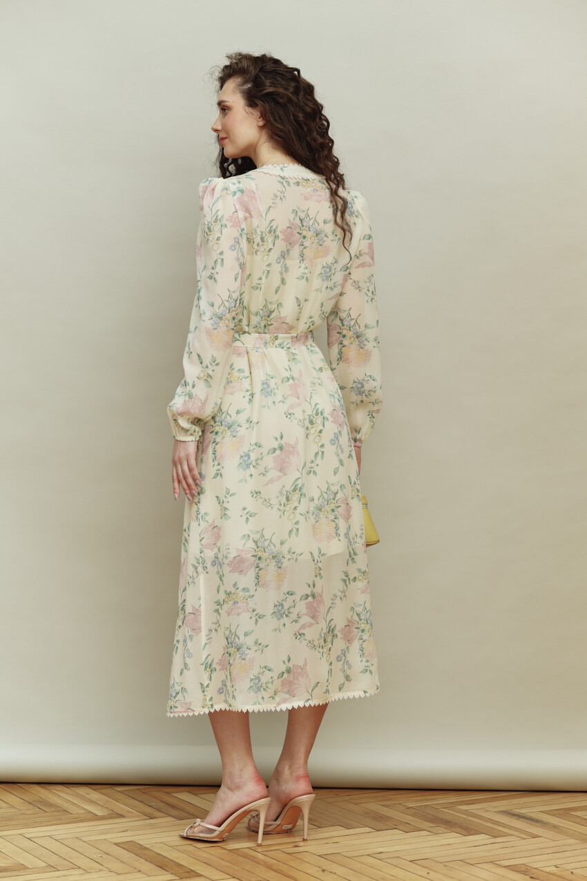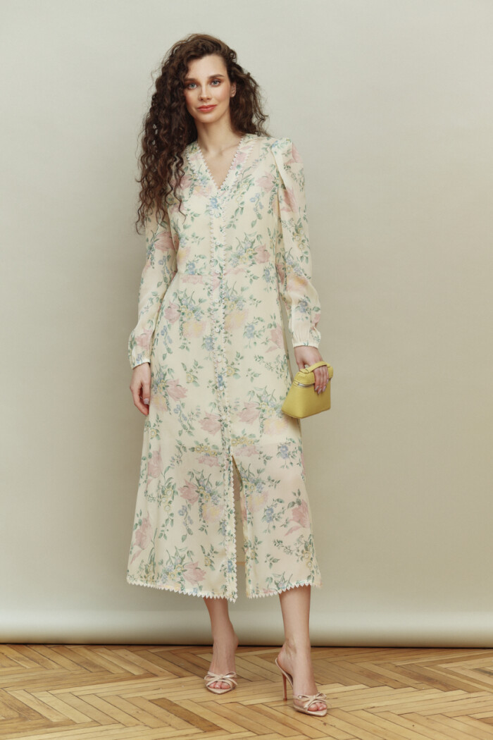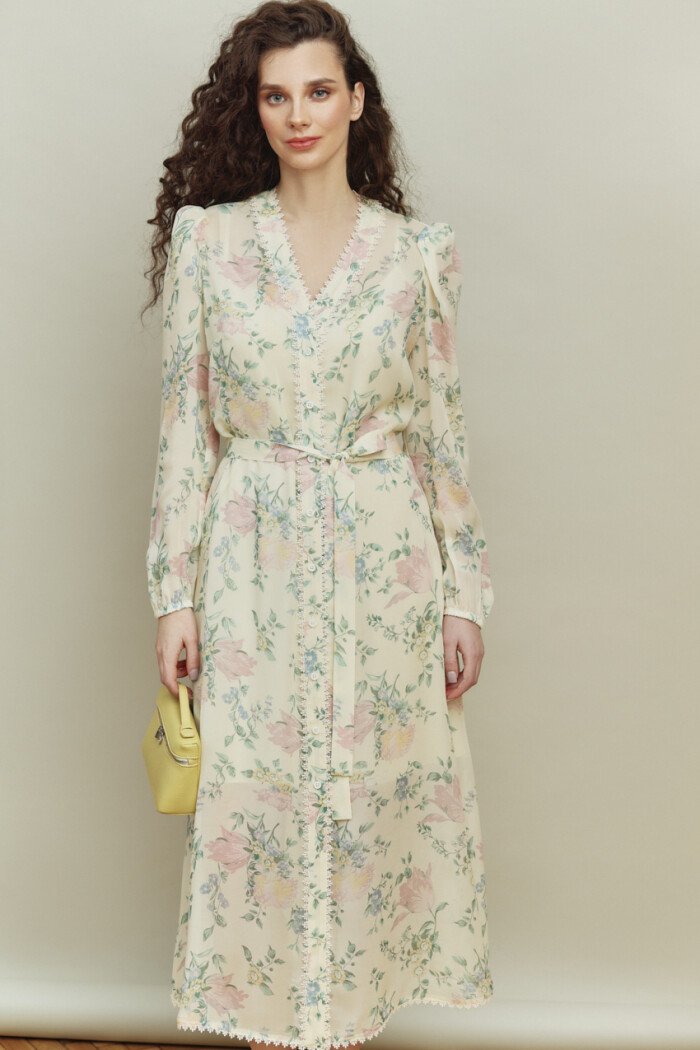 Элегантное платье в стиле city chic выполнено из струящегося вискозного полотна с актуальным дизайнерским принтом. Модель полуприлегающего силуэта, отрезная по линии талии с расширенной к низу юбкой. V-образный вырез горловины переходит в планку с застежкой на декоративные пуговицы и петли. В качестве декора по низу платья, обтачному краю планки и шву притачивания к деталям переда и спинки вставлена кружевная тесьма. Длинные втачные рукава с эластичной тесьмой внизу и с четырьмя заложенными встречными складками по окату, которые создают объём верхней части рукава. Талию подчеркивает съемный пояс из основного полотна. Модель комплектуется широким драпированным поясом из основного полотна на навесные петли и пуговицы. Изделие на подкладке из вискозного полотна. Длина изделия — 126 см; длина рукава — 65 см.