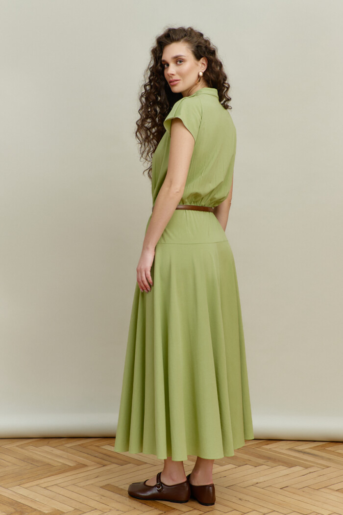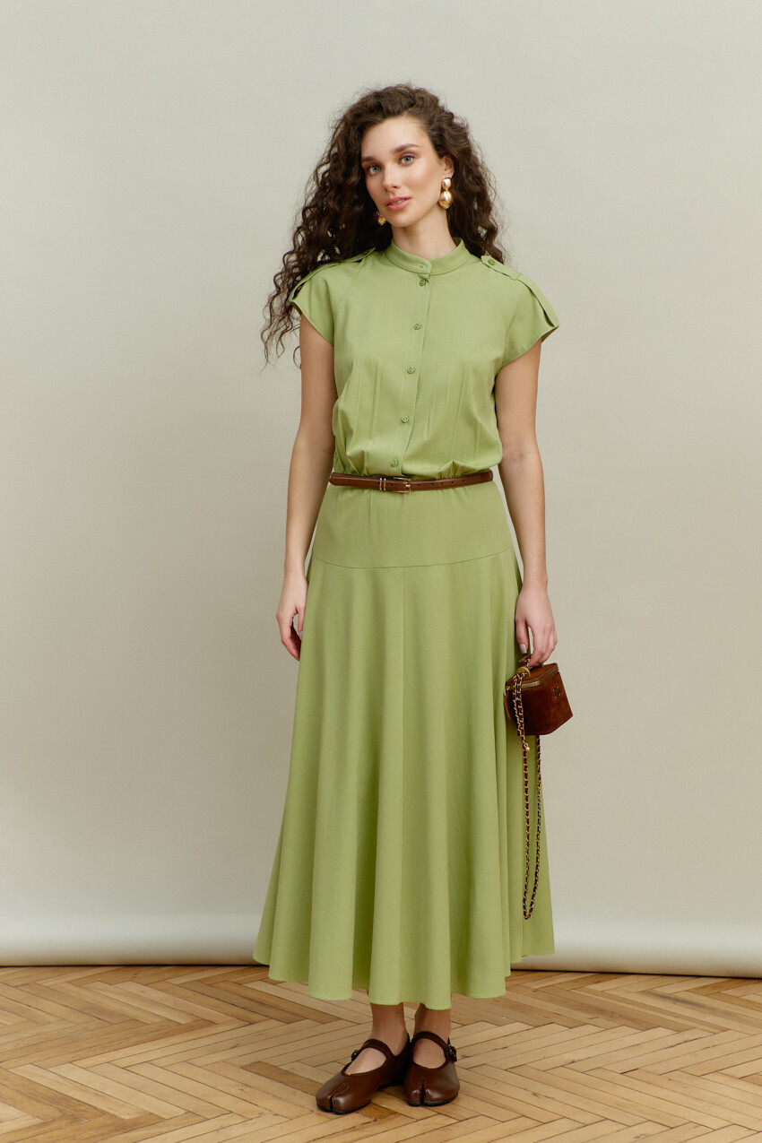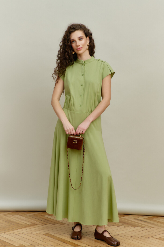 Элегантное платье выполнено из костюмно-плательного полотна. Модель полуприлегающего силуэта, отрезная по линии талии с притачной широкой кокеткой и расширенной к низу юбкой. Воротник-стойка. По центру переда, до линии талии, цельнокроенная планка на петли и декоративные пуговицы. Втачные короткие рукава «крылышки» с патами, протянутыми через шлёвку и зафиксированными прорезной петлёй и декоративной пуговицей на плече. Длина изделия — 137 см, длина рукава — 23 см.