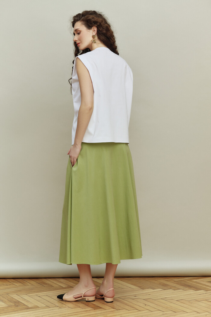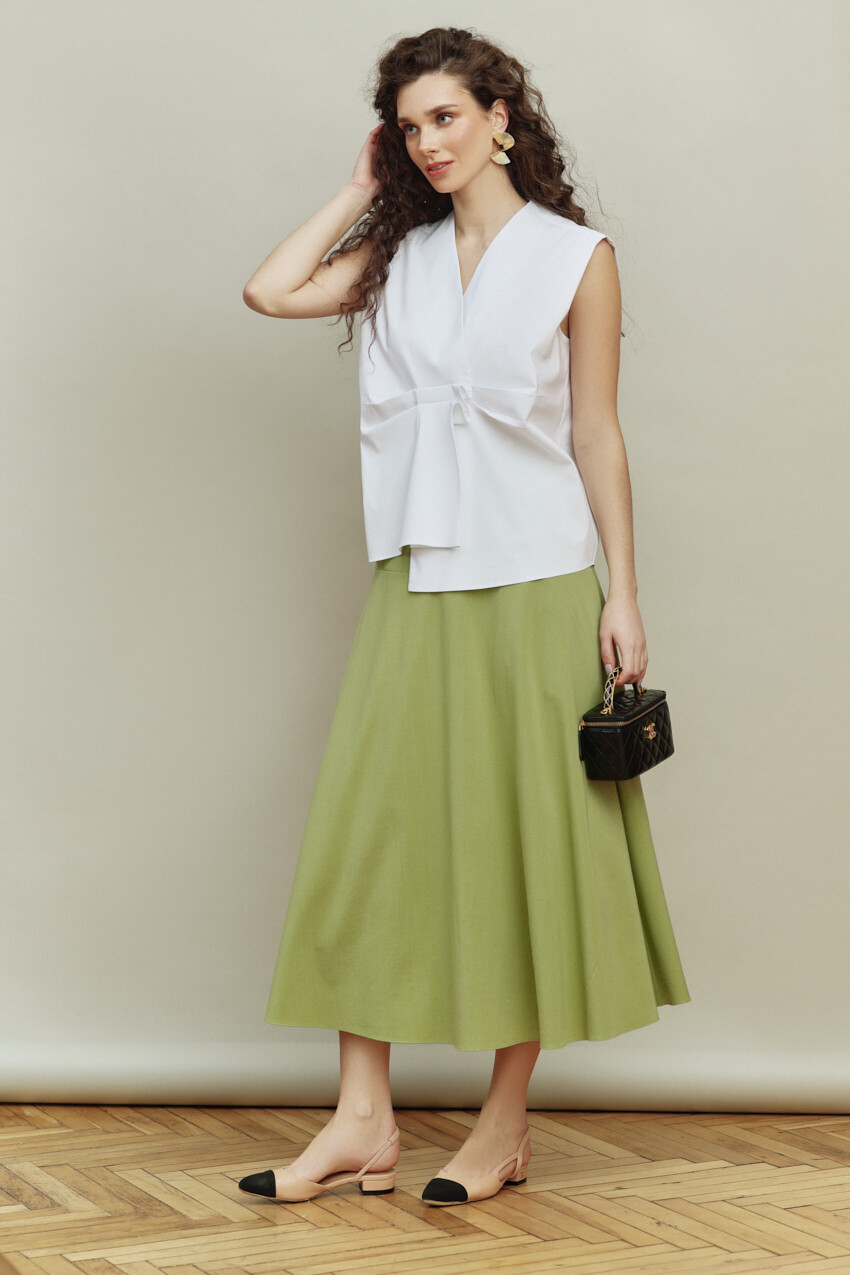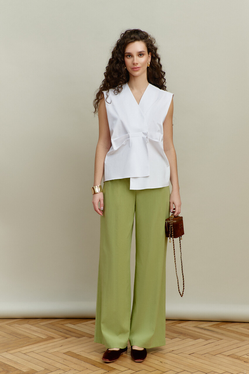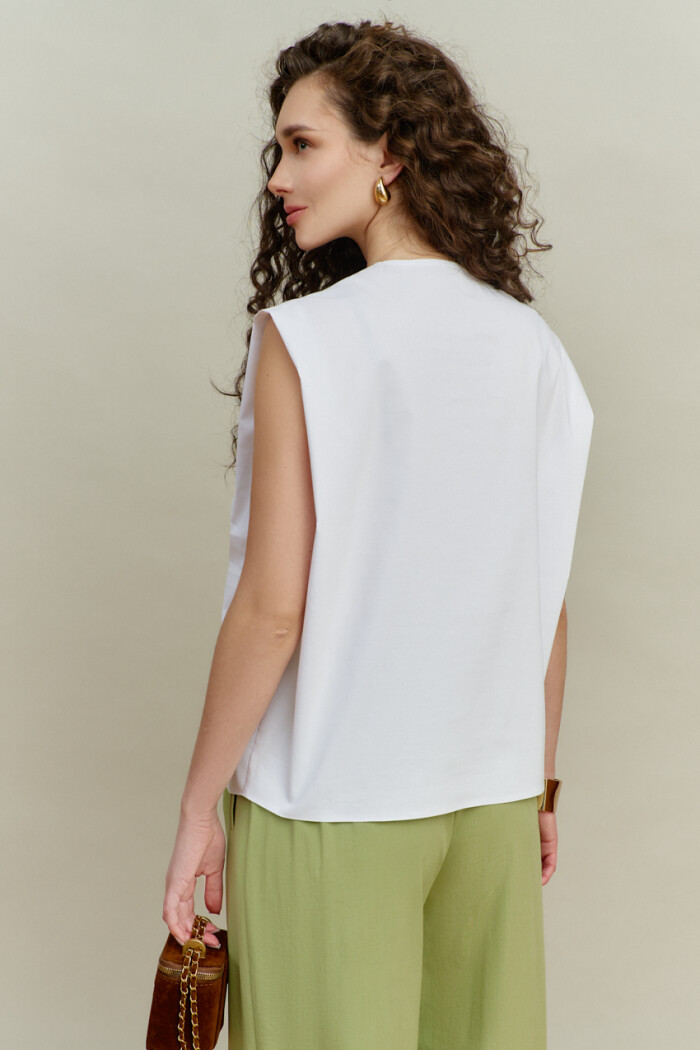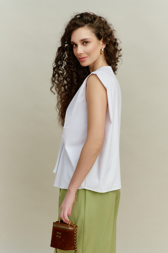 Блузка в стиле smart casual выполнена из хлопкового полотна. Модель прямого силуэта без рукава. На деталях переда (в области линии талии) стачаны односторонние асимметричные глубокие складки, а детали переда расположены на запах (частично настрочены друг на друга), образуя V-образный вырез горловины. Линия плеча расширена, а по плечевому шву заложена и зафиксирована односторонняя складка. Длина изделия — 62 см.