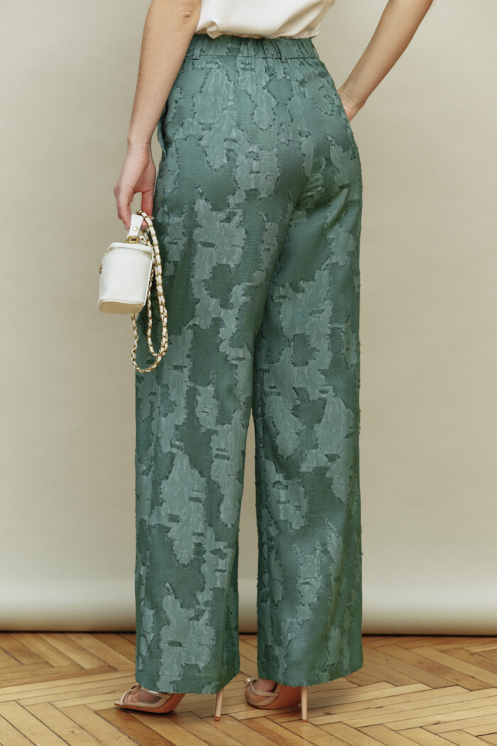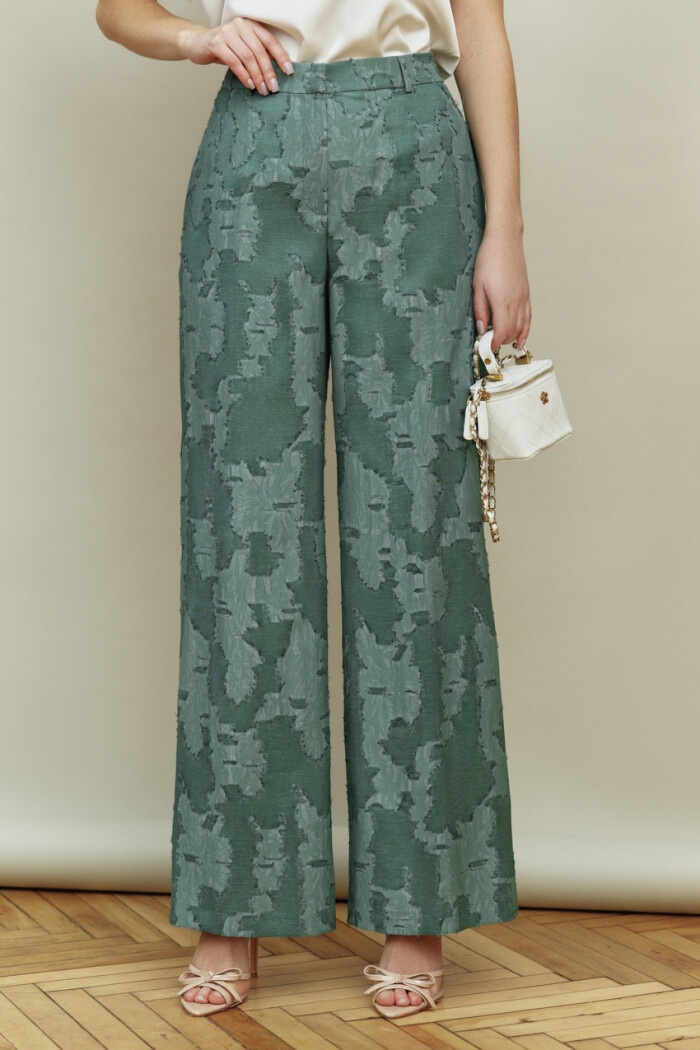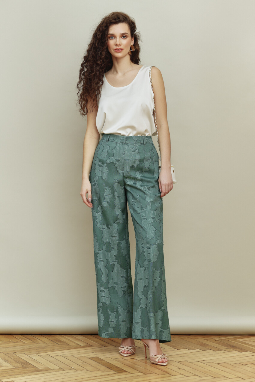 Классические брюки прямого силуэта выполнены из жаккардового полотна. Модель с комфортной средней посадкой на притачном поясе с эластичной тесьмой по спинке, с застёжкой на тесьму-«молнию» и потайным брючным крючком. Спереди выполнены боковые карманы «в швах». Длина изделия по боковому шву (с поясом) — 111 см.
