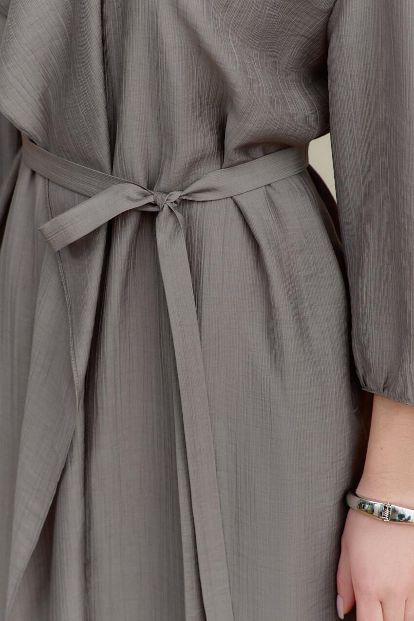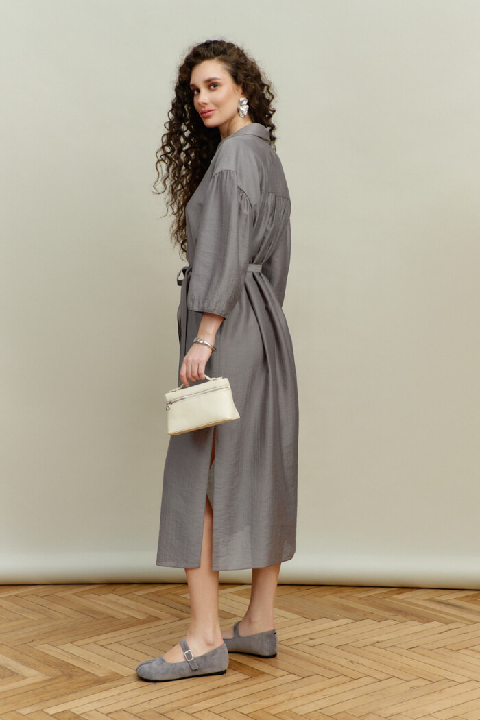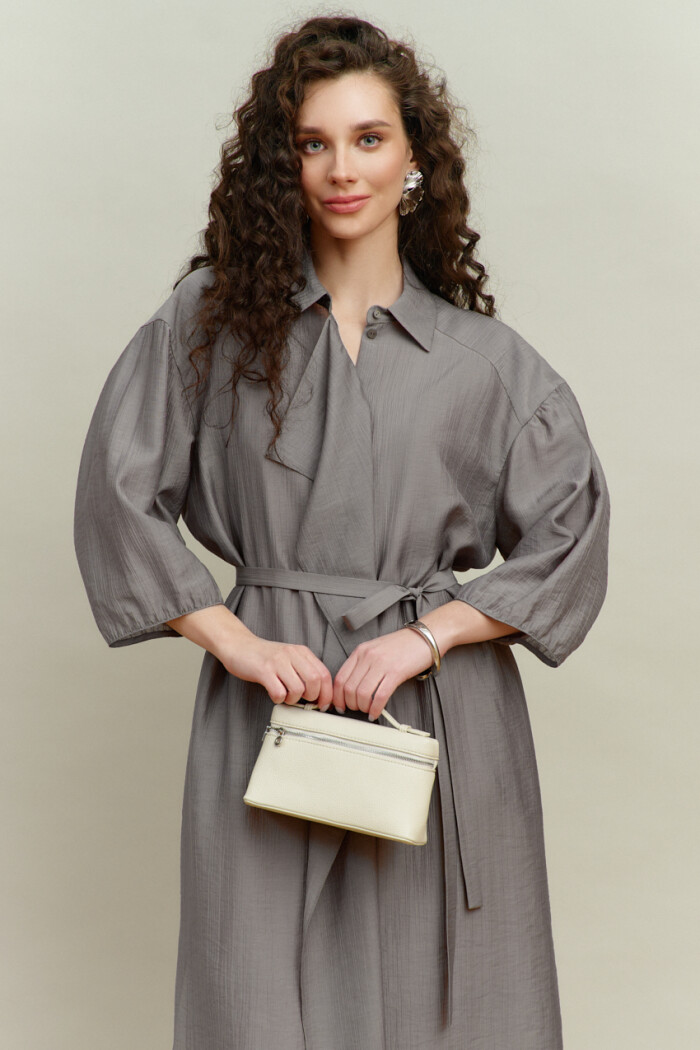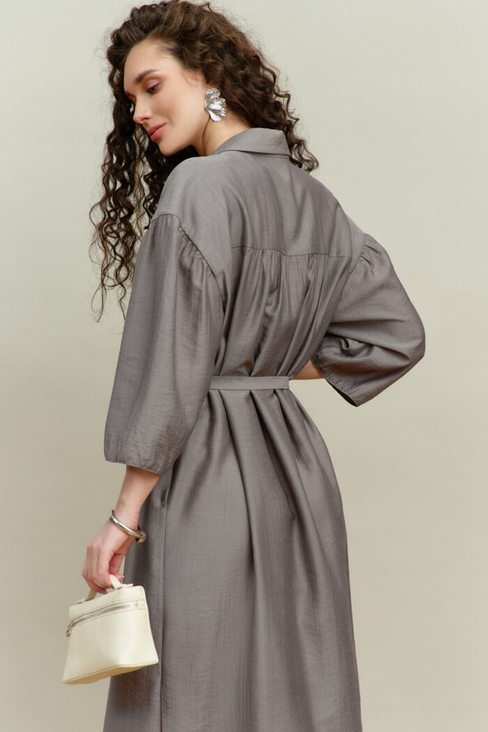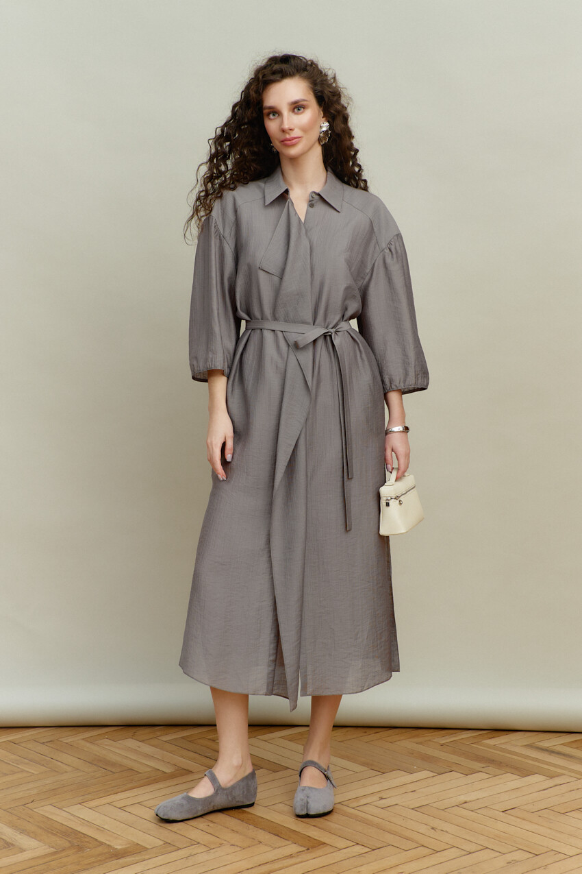 Элегантное платье выполнено из плательного полотна. Модель прямого силуэта, со спущенной линией плеча. Воротник отложной на стойке. По центру переда планка на петли и декоративные пуговицы. В качестве декора вдоль края правого борта вставлена отлетная деталь, имитирующая волан. По центру спинки — сборка, направленная от кокетки. Для удобства в носке в боковых швах предусмотрены функциональные карманы. Втачные короткие рукава с лёгкой сборкой по окату и по низу рукава. К платью прилагается съёмный завязывающийся пояс из основной ткани. Модель комплектуется комбинацией из вискозного полотна на регулируемых по длине бретелях. Длина изделия — 125 см, длина рукава (от горловины) — 61 см.