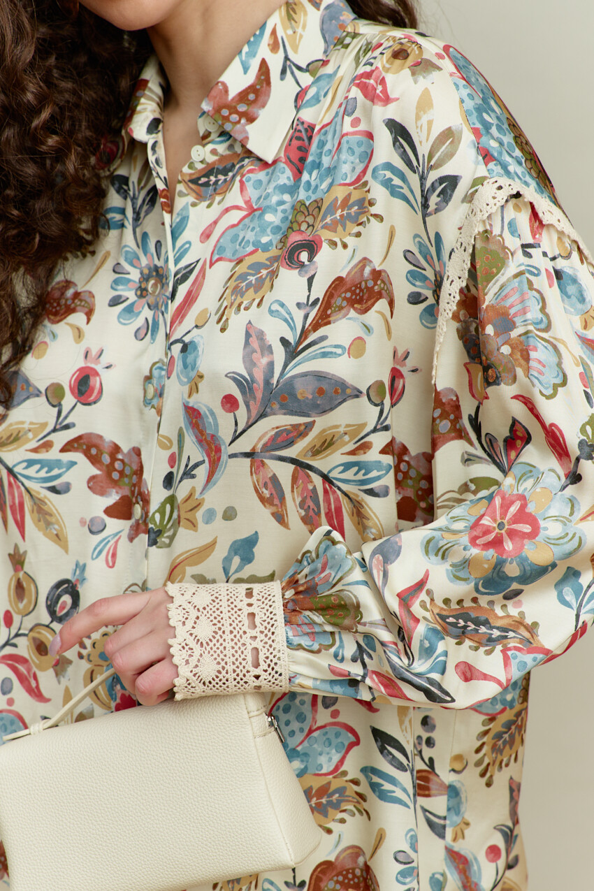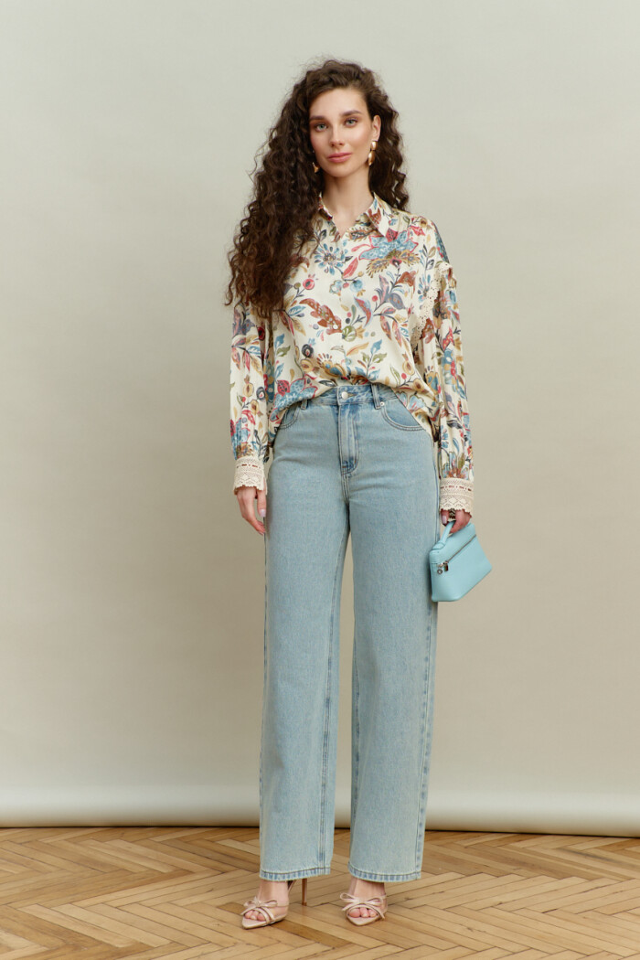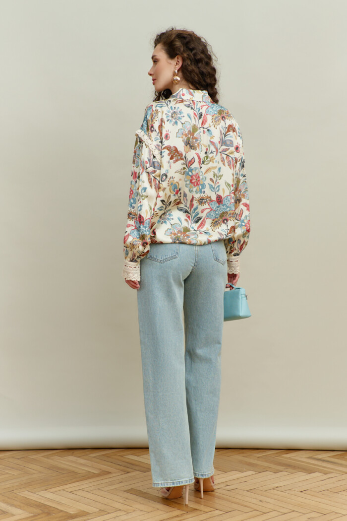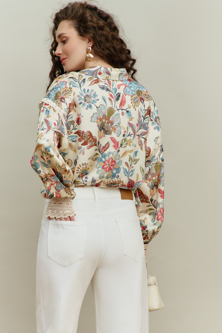 Блузка-рубашка в стиле smart casual выполнена из итальянского полотна с анималистическим принтом. Модель свободного кроя, со спущенной линией плеча. Воротник отложной на стойке. Спереди предусмотрена застёжка на петли и декоративные пуговицы. По спинке сборка направлена от горловины. Рукава втачные, длинные, с лёгкой сборкой по окату и декоративной тесьмой. Особый вид изделию придаёт манжета из декоративной широкой тесьмы, застёгивающаяся на навесную петлю, направленная от присобранного низа рукава. Длина по спинке — 66 см; длина рукава (от горловины) — 75 см.