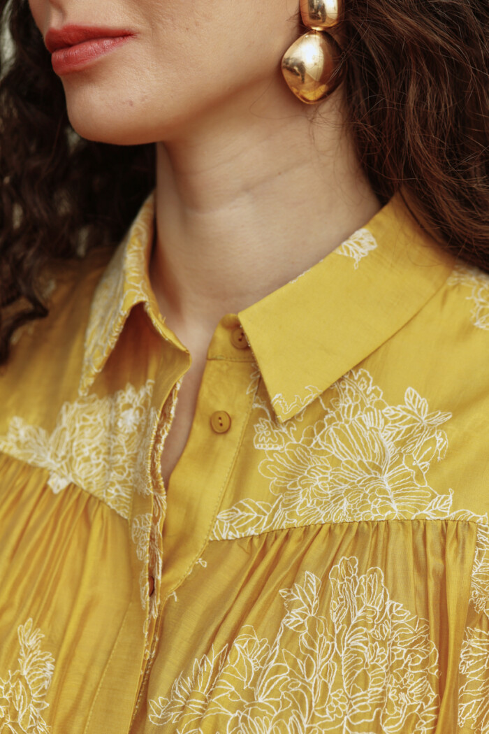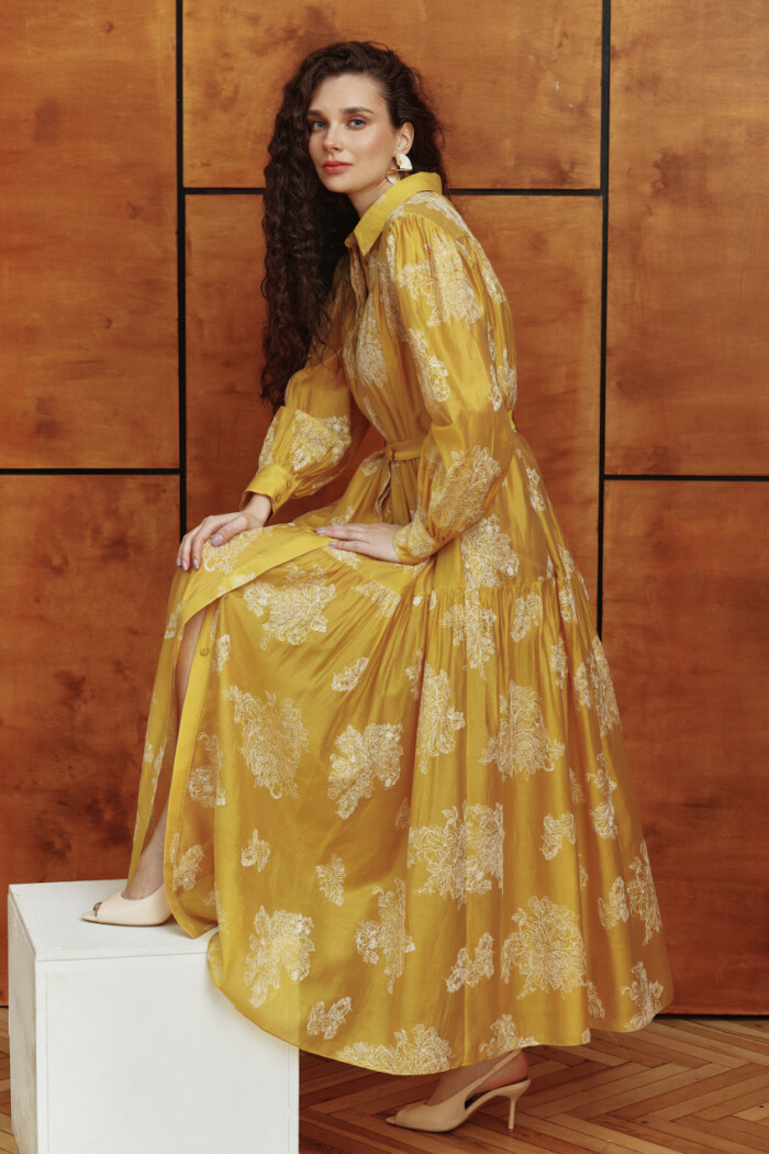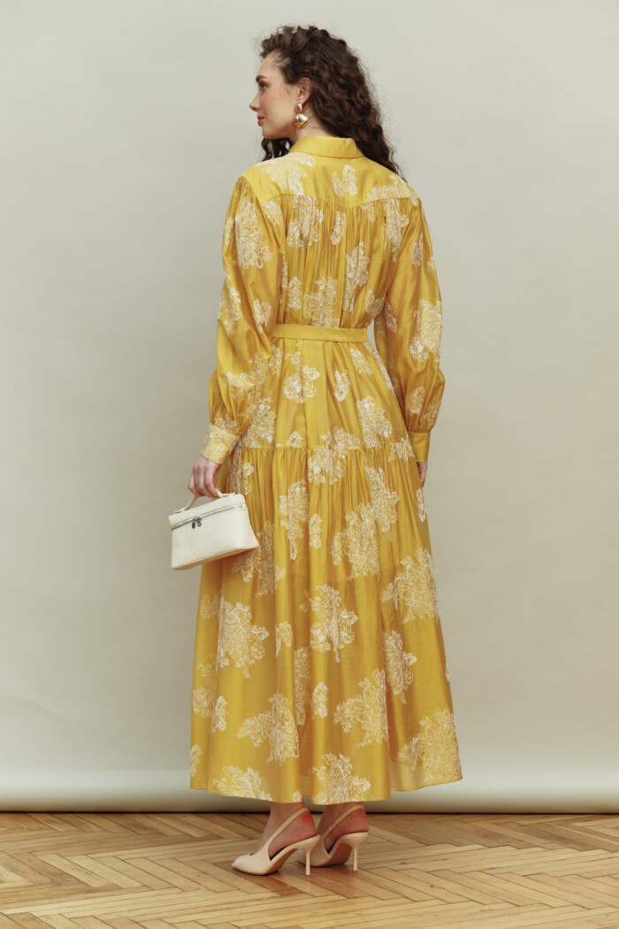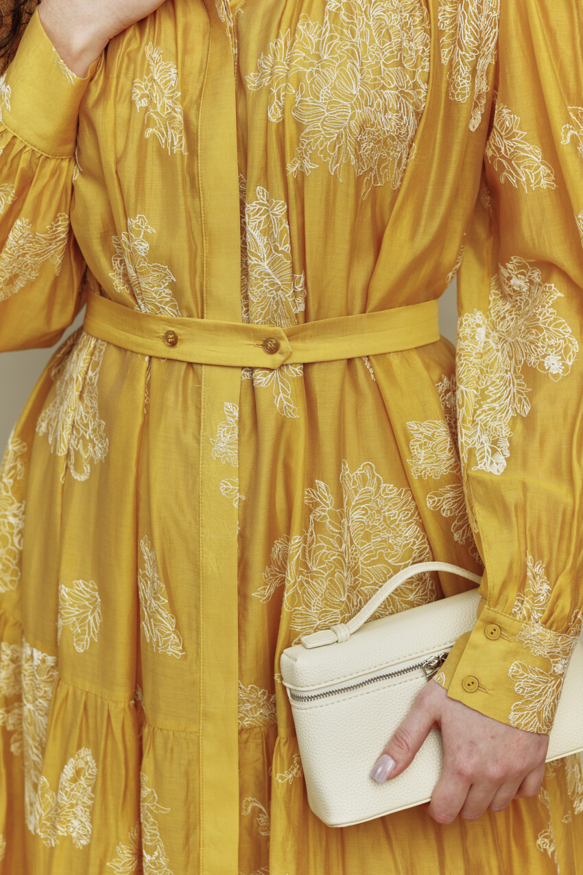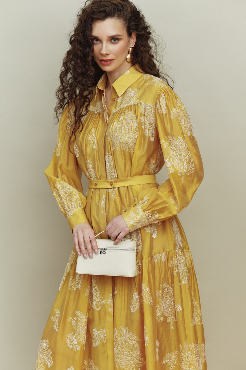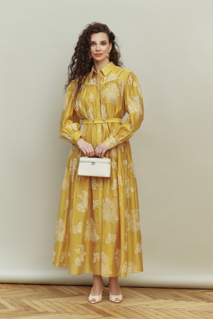Элегантное платье в стиле city chic выполнено из полупрозрачной вуали с объёмной вышивкой. Модель расширенного силуэта. Воротник отложной на стойке. По центру переда — отрезная потайная планка на петли и декоративные пуговицы. Для удобства в носке в боковых швах предусмотрены карманы. По спинке и переду — сборка от фигурной кокетки, а также чуть ниже бедер — подрез, в который притачан волан со сборкой по верхнему срезу. Втачные длинные рукава со сборкой по окату и по низу рукава вдоль застёгивающейся манжеты. К платью прилагается съёмный пояс из основного полотна на петли и с декоративными пуговицами. Модель комплектуется комбинацией из вискозного полотна на регулируемых по длине бретелях. Длина изделия — 138 см, длина рукава — 64 см.