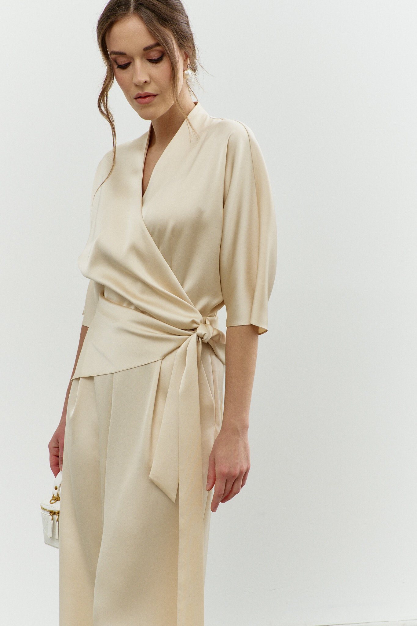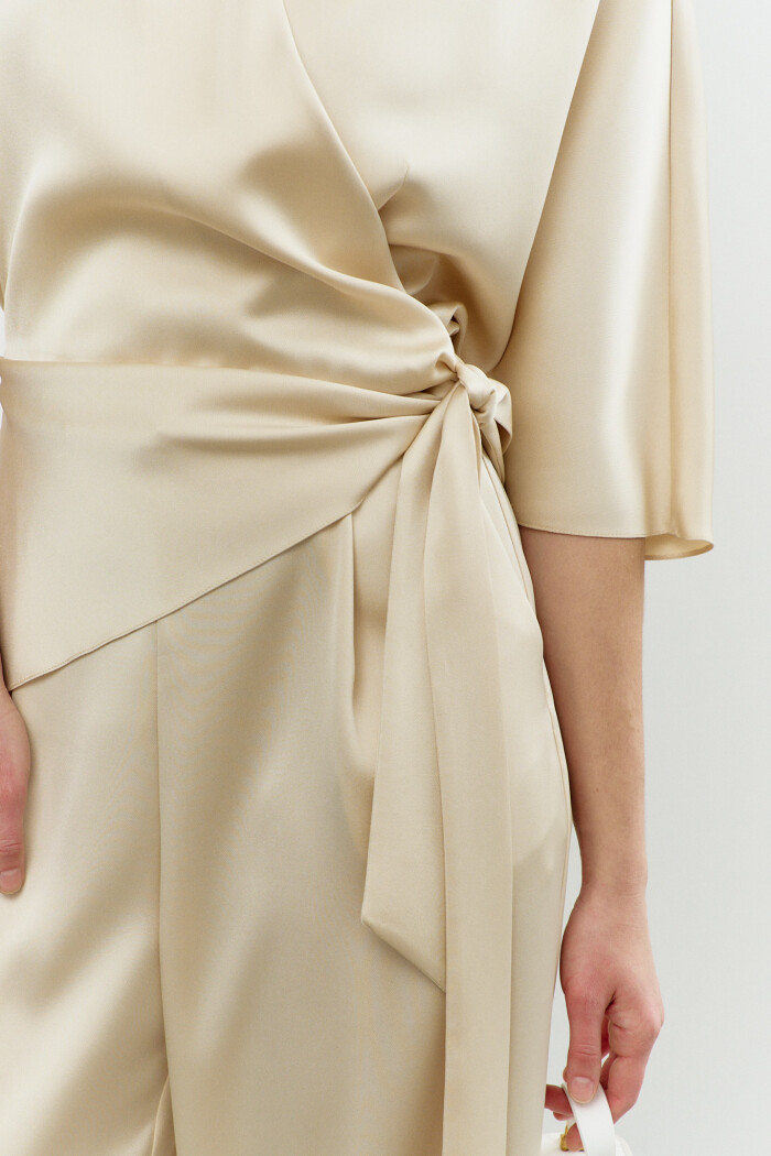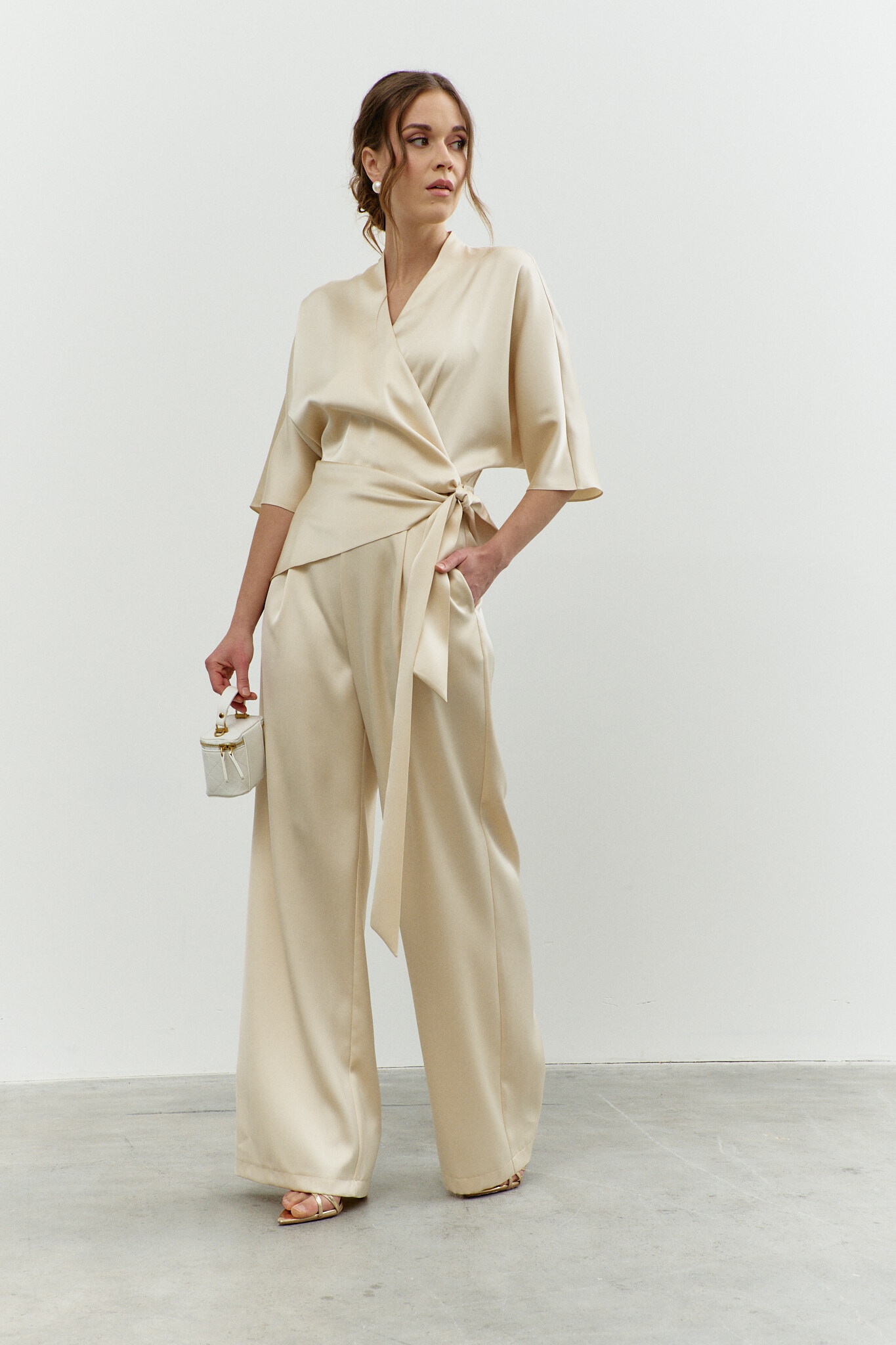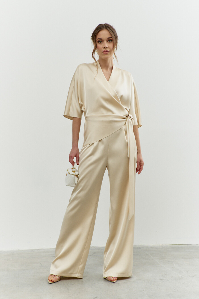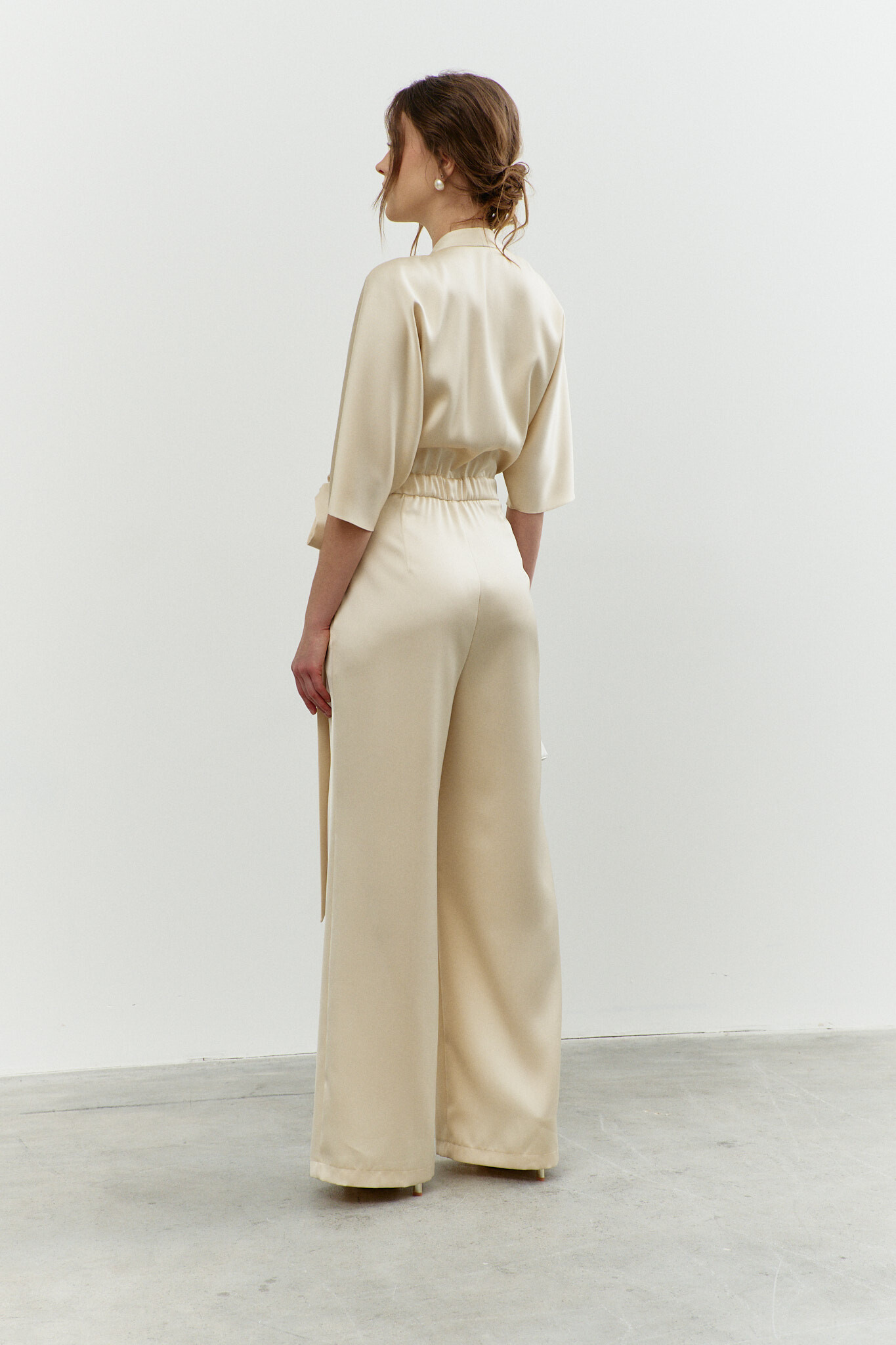 Элегантный комбинезон в стиле City Chic выполнен из струящегося полотна с благородным блеском. Модель полуприлегающего силуэта, отрезной по линии талии. V-образный вырез горловины со стойкой на потайную пуговицу и на навесную петельку. Для удобства в носке спереди предусмотрена потайная застёжка на тесьму "молнию". Перед декорирован втачными длинными поясами, которые дважды опоясывают талию. Брюки со складками по линии талии и косыми карманами. Длина спинки 40 см; длина брюк по боковому 114 см; длина рукава 60 см.