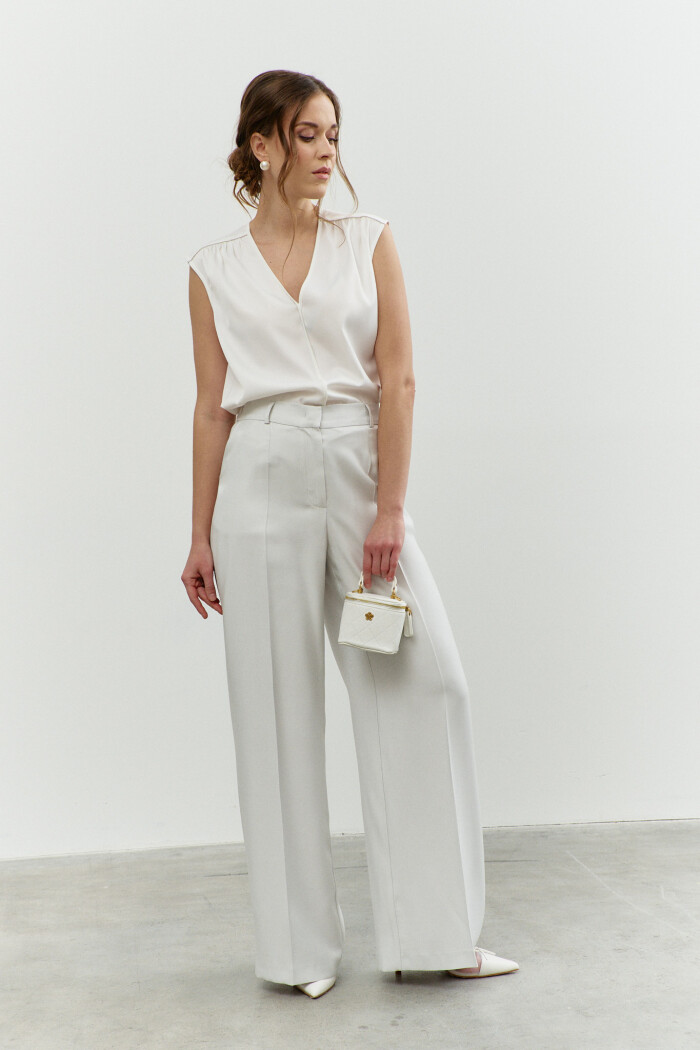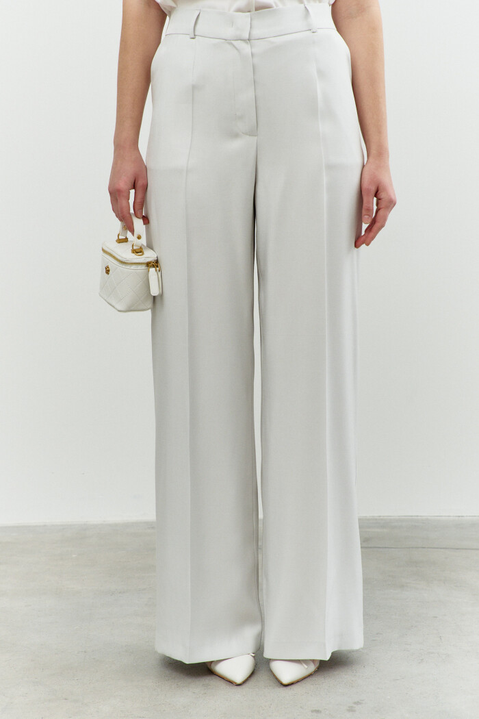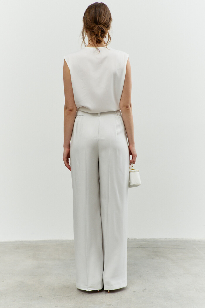 Зауженные брюки выполнены из костюмного полотна. Модель с комфортной средней посадкой на притачном поясе, с широкой эластичной лентой между слоями; застегивающимися на потайной брючный крючок. Для удобства в носке спереди предусмотрены карманы в боковых швах и застежка на тесьму «молнию». Длина изделия (с поясом) 100 см.