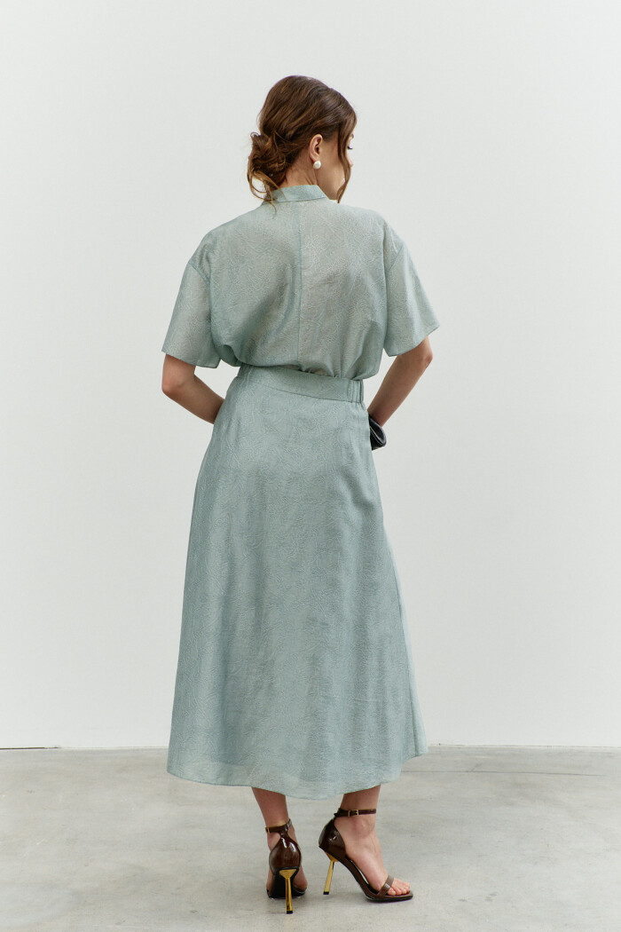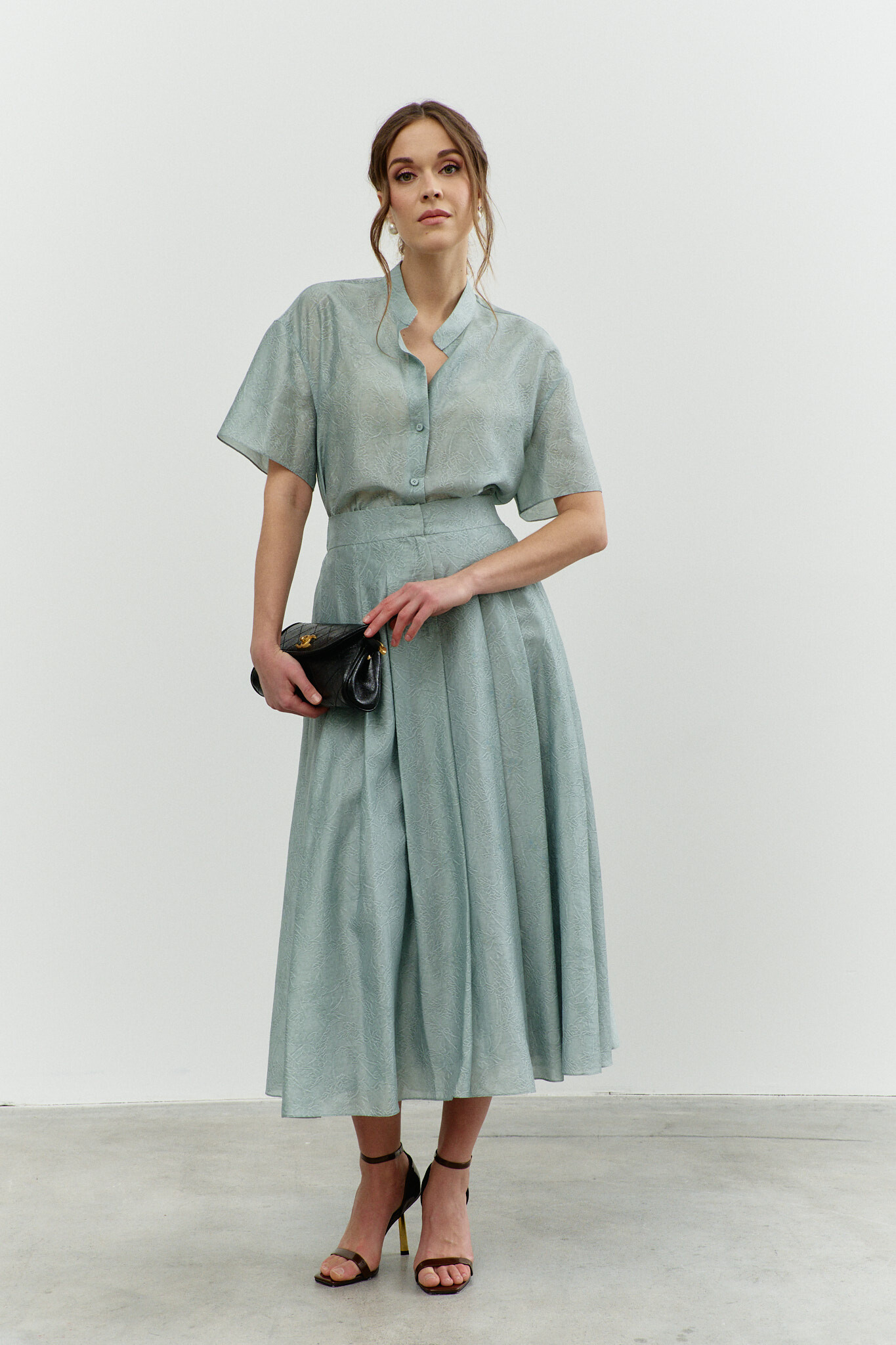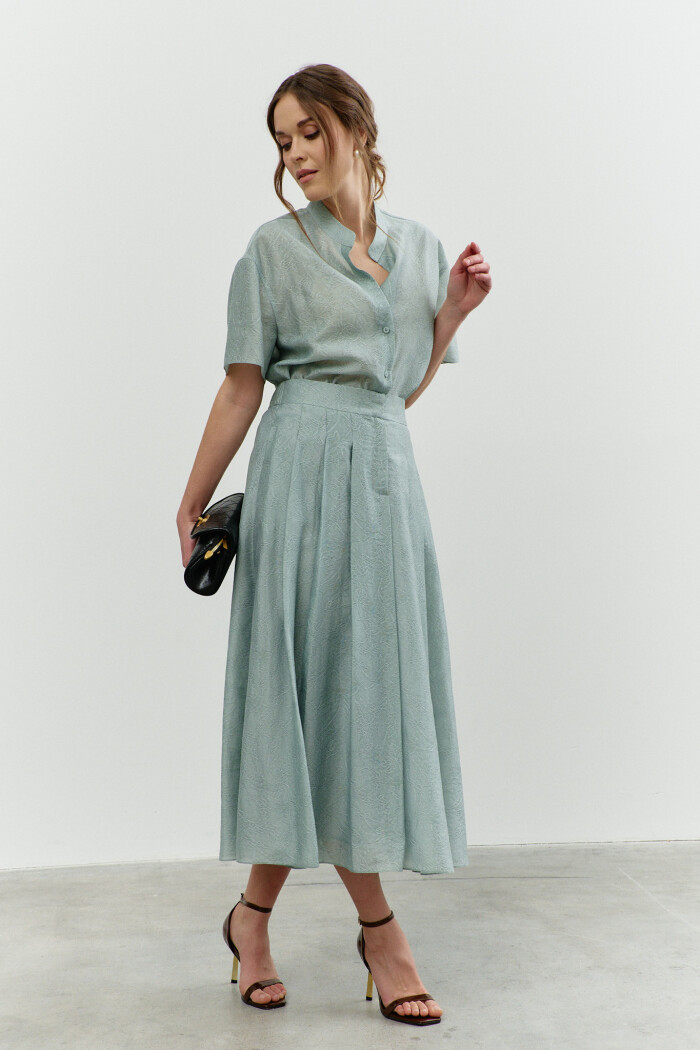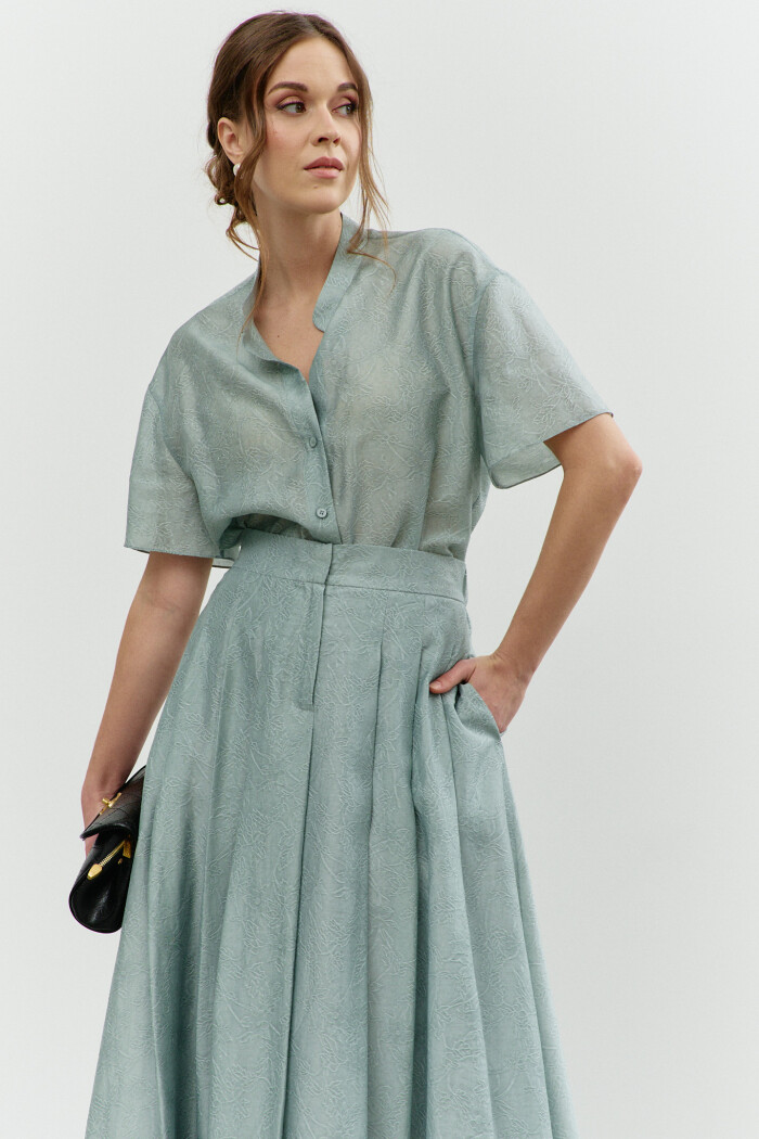 Блузка в стиле City Chic выполнена из полупрозрачного крэш-шифона с благородным блеском. Модель свободного силуэта. Горловина круглой формы с изящной сборкой. Для удобства в носке в среднем шве спинке обработан разрез на навесную петлю и пуговицу. Длинные объемные рукава покроя реглан по верху глубокими складками, переходящими на перед и спинку, и с эластичной тесьмой внизу. Модель комплектуется топом из вискозного полотна на регулируемых по длине бретелях. Длина изделия 57 см; длина рукава (от горловины) 63 см.