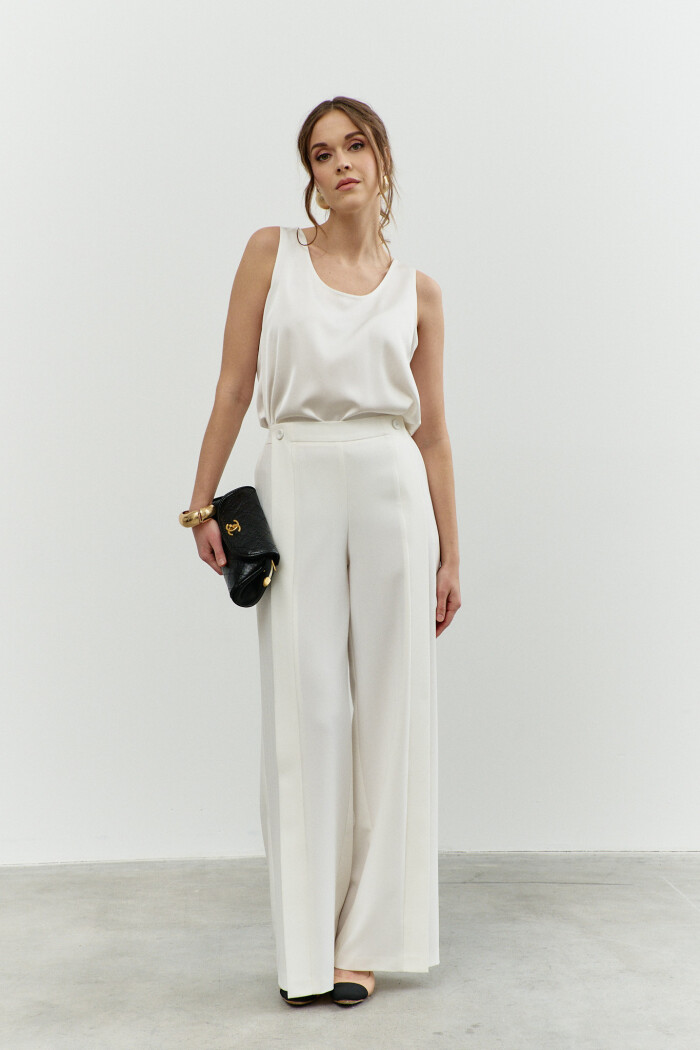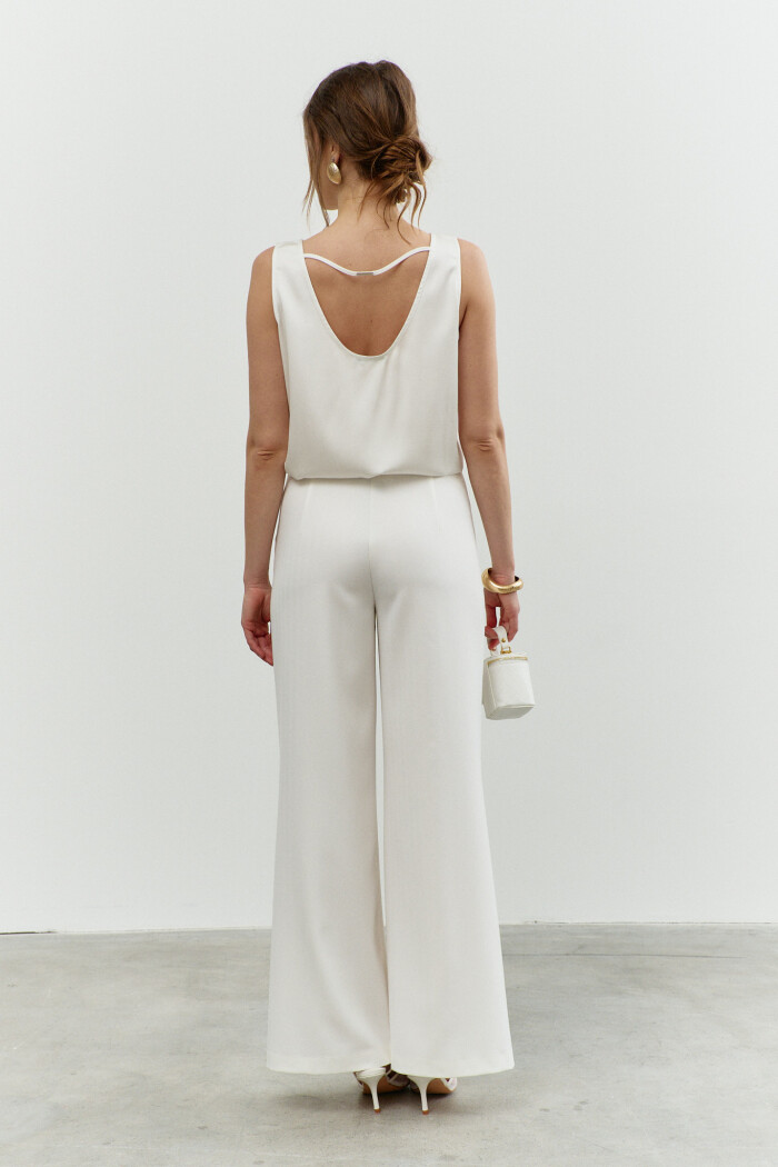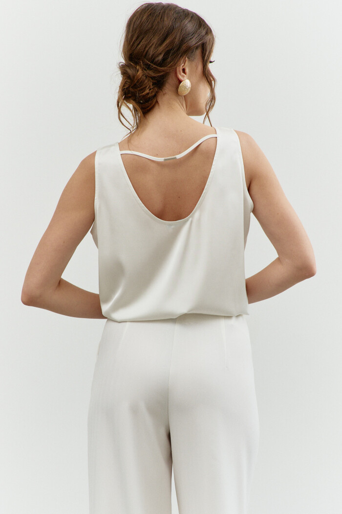 Блузка женская выполнена из вискозного полотна. Модель прямого силуэта с расширенной и углубленной горловиной без рукава. Особый вид изделию придает перемычка по спинке. Длина изделия 41 см.