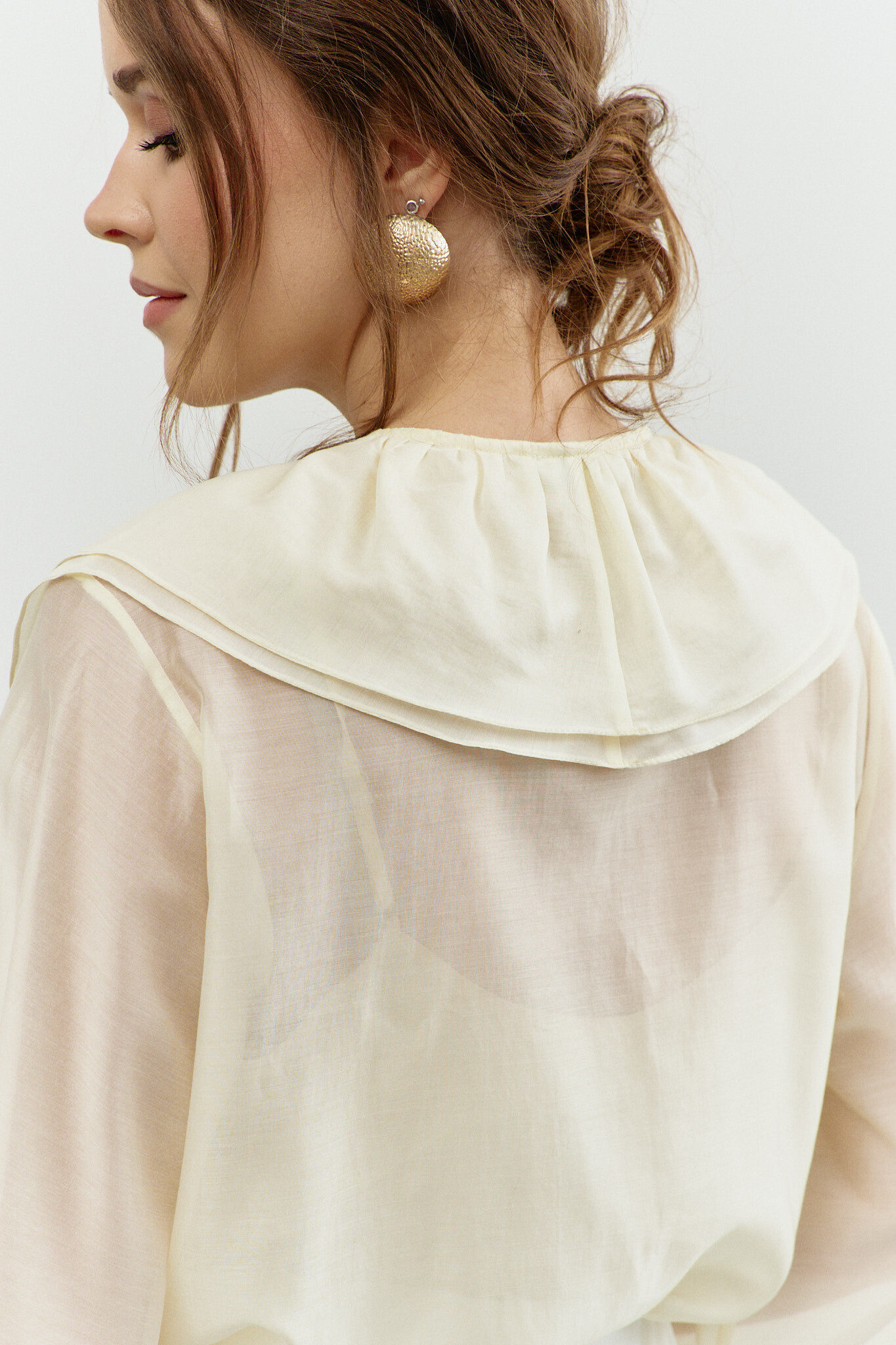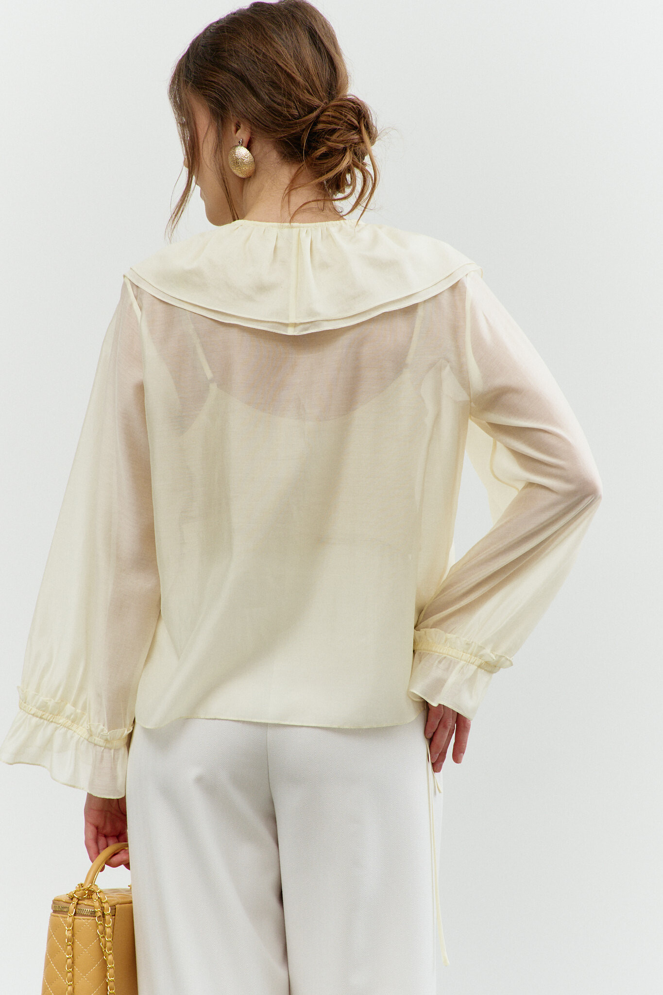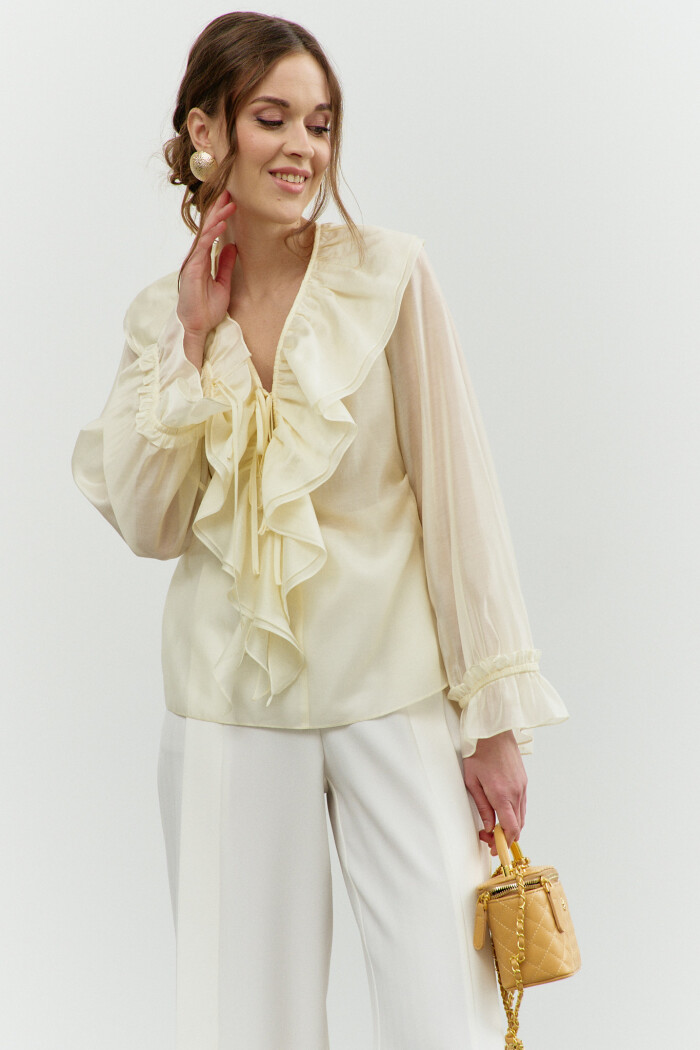 Блузка в стиле City Chic выполнена из полупрозрачного крэш-шифона с благородным блеском. Модель свободного силуэта. Горловина круглой формы с изящной сборкой. Для удобства в носке в среднем шве спинке обработан разрез на навесную петлю и пуговицу. Длинные объемные рукава покроя реглан по верху глубокими складками, переходящими на перед и спинку, и с эластичной тесьмой внизу. Модель комплектуется топом из вискозного полотна на регулируемых по длине бретелях. Длина изделия 57 см; длина рукава (от горловины) 63 см.