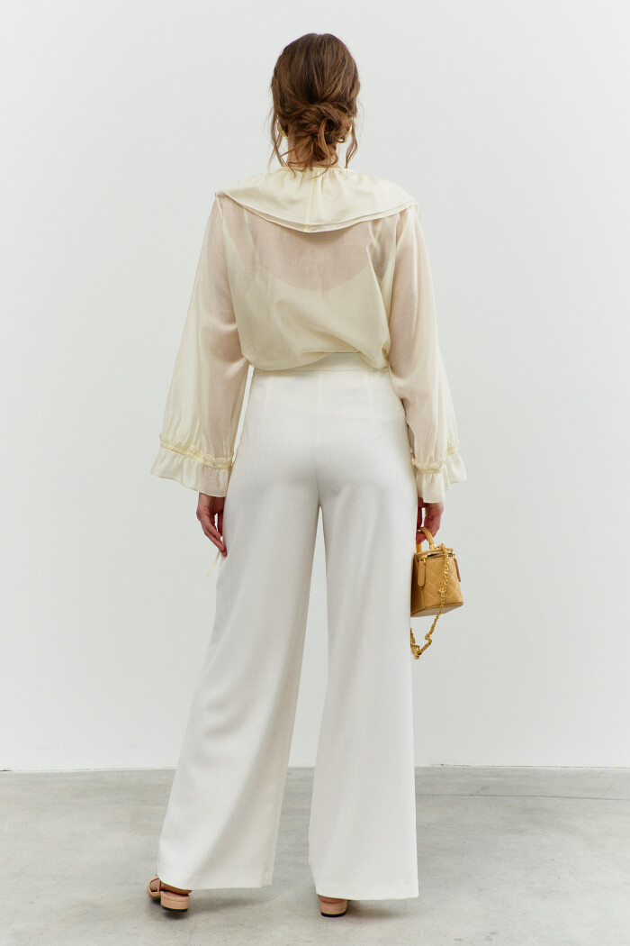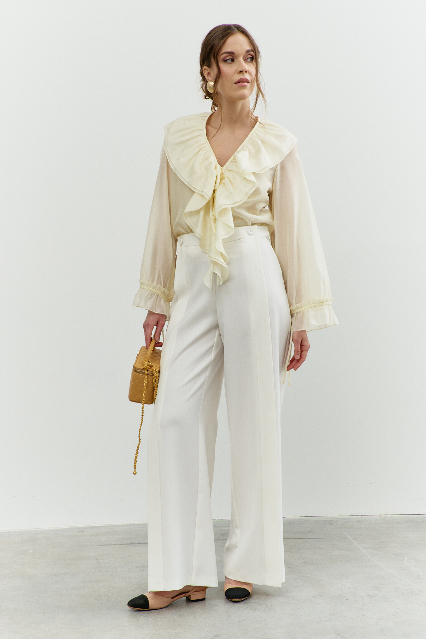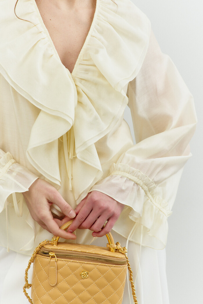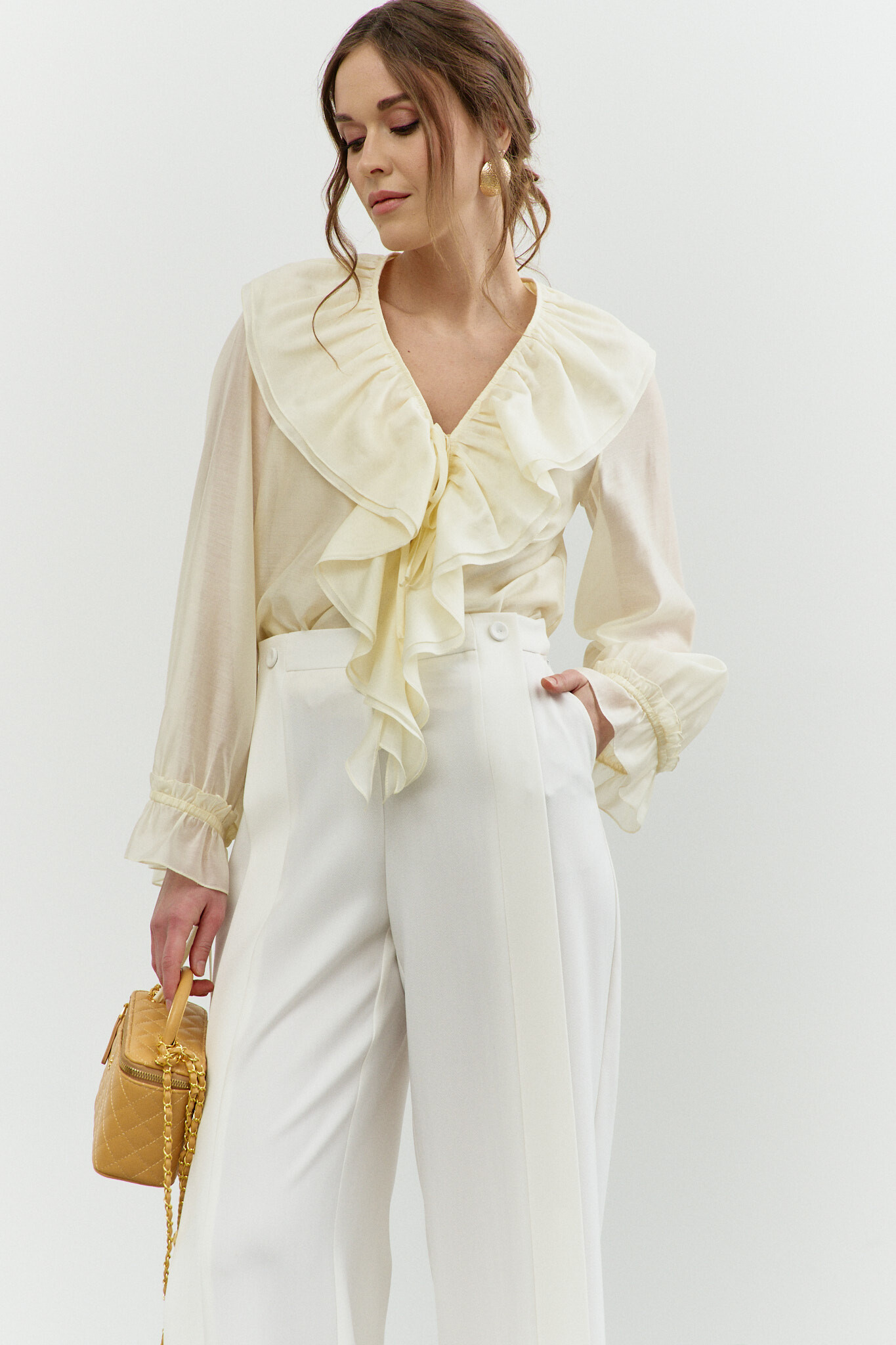 Блузка в стиле City Chic выполнена из полупрозрачного крэш-шифона с благородным блеском. Модель свободного силуэта. Горловина круглой формы с изящной сборкой. Для удобства в носке в среднем шве спинке обработан разрез на навесную петлю и пуговицу. Длинные объемные рукава покроя реглан по верху глубокими складками, переходящими на перед и спинку, и с эластичной тесьмой внизу. Модель комплектуется топом из вискозного полотна на регулируемых по длине бретелях. Длина изделия 57 см; длина рукава (от горловины) 63 см.