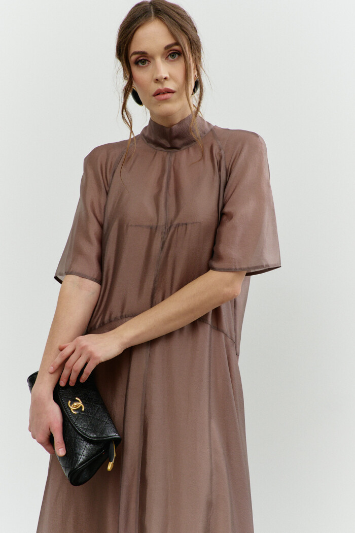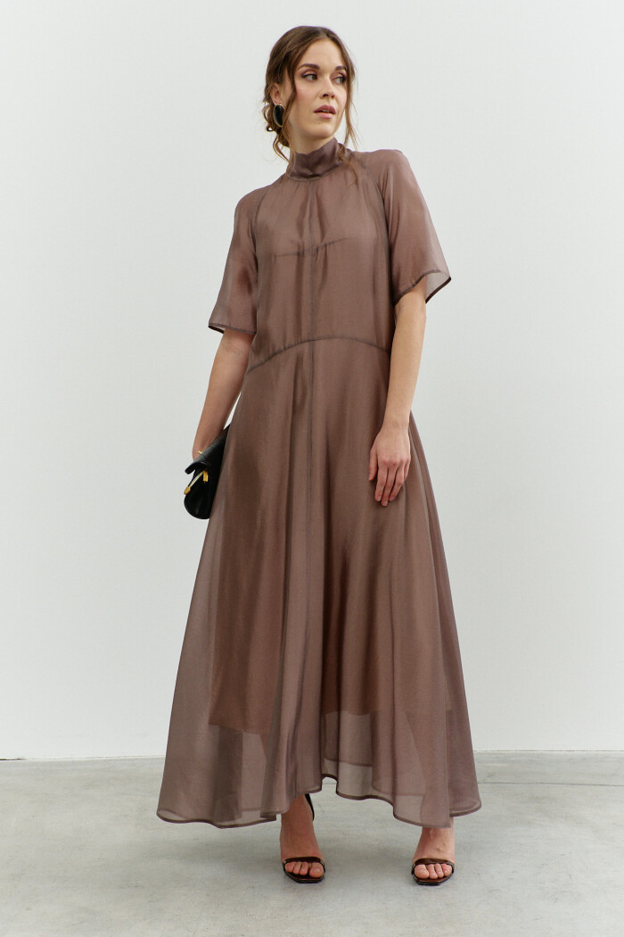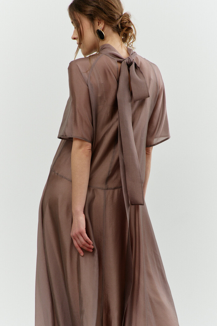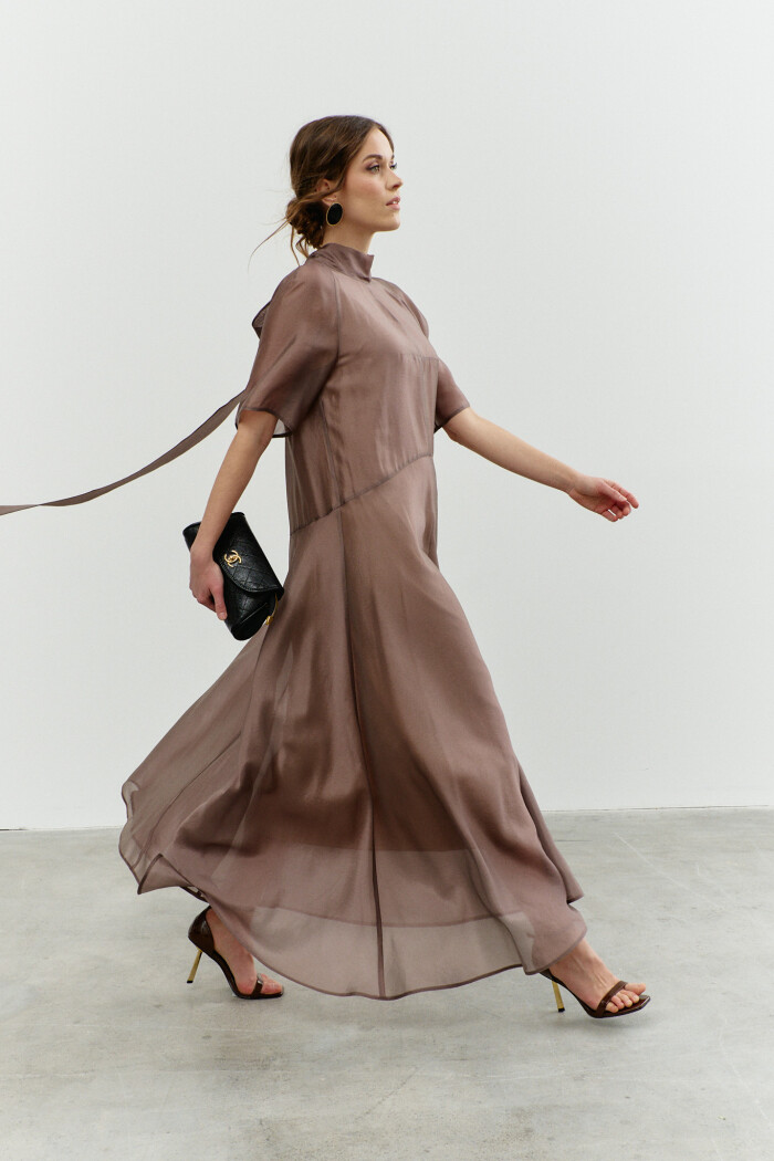 Элегантное платье в стиле City Chic выполнено из полупрозрачной вуали с лёгким блеском. Модель А-силуэта, который плавно расширяется от талии к подолу. Фигурный подрез ниже линии талии, разделяет платье на верхнюю и нижнюю часть. Воротник-стойка, переходящий на спинку в пояса-завязки. Перед верхней части платья со средним швом и стачанными горизонтальными нагрудными выточками от среднего шва к центру груди, спинка верхней части платья со средним швом, в котором от горловины вниз выполнен разрез. Рукава покроя реглан длиной выше линии локтя. Модель комплектуется комбинацией из вискозного полотна на регулируемых по длине бретелях. Длина изделия 139 см; длина рукава (от горловины) 43 см.