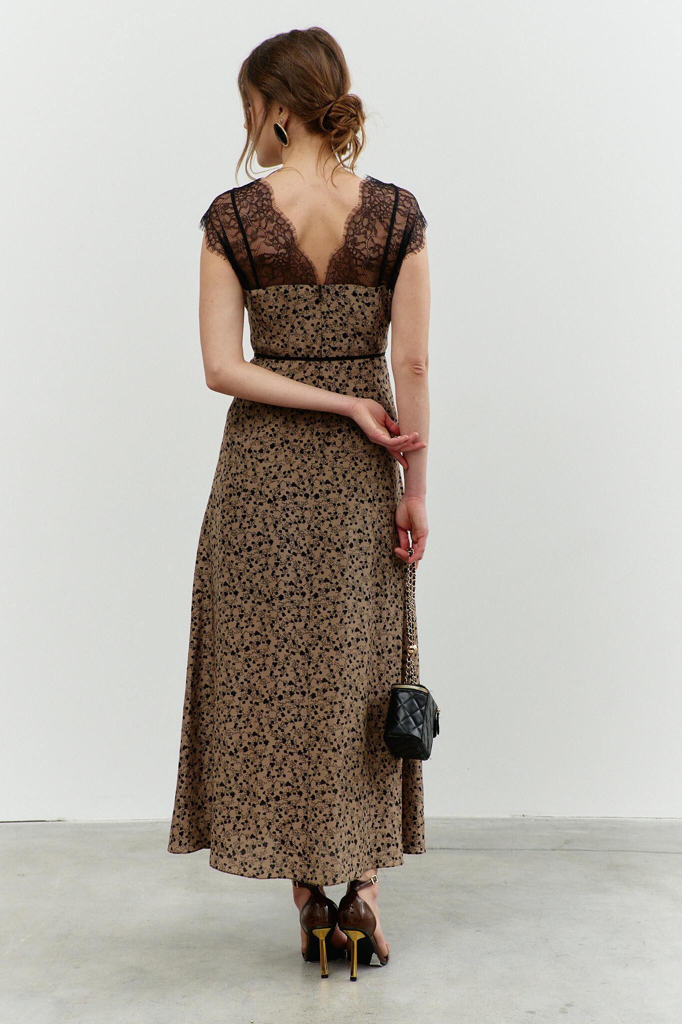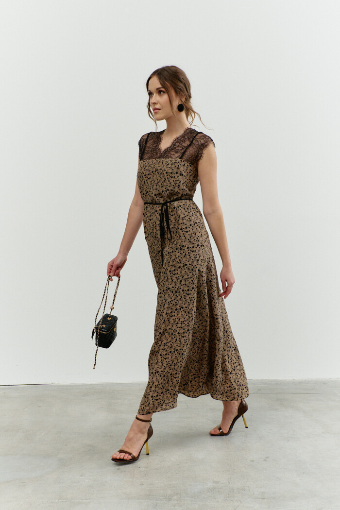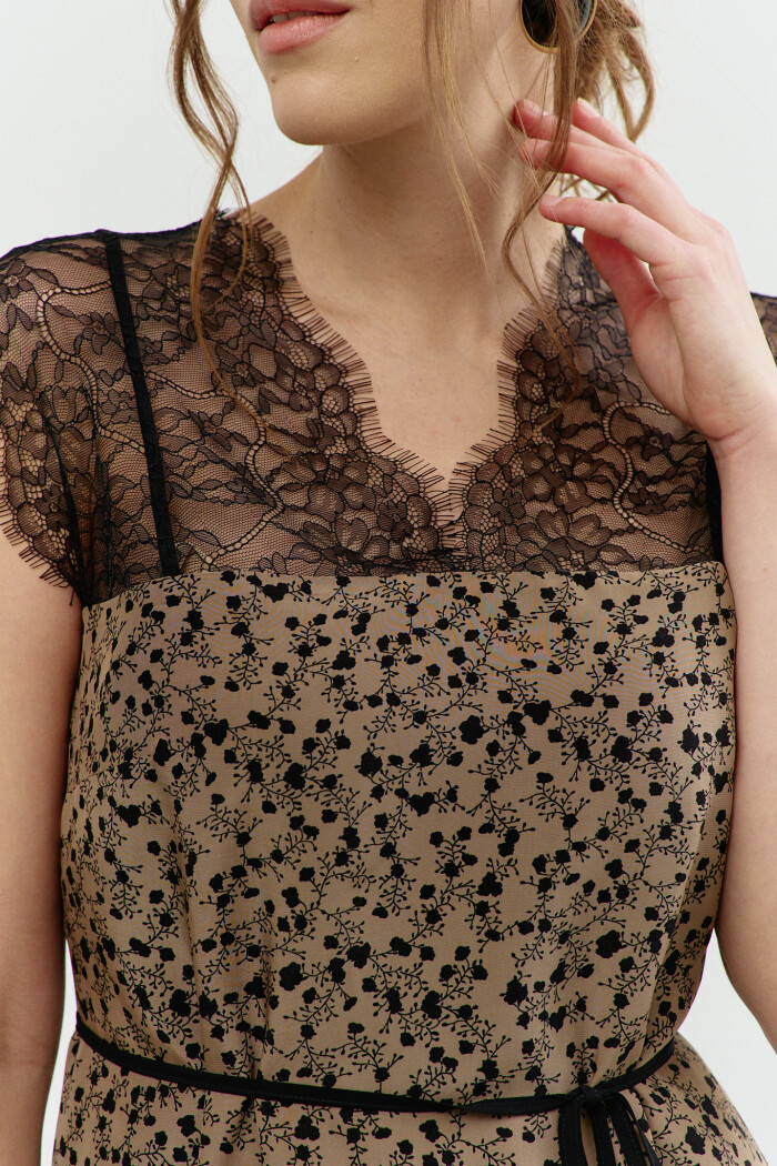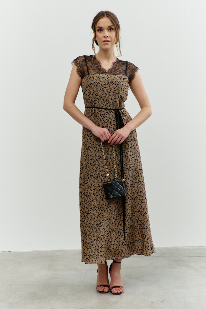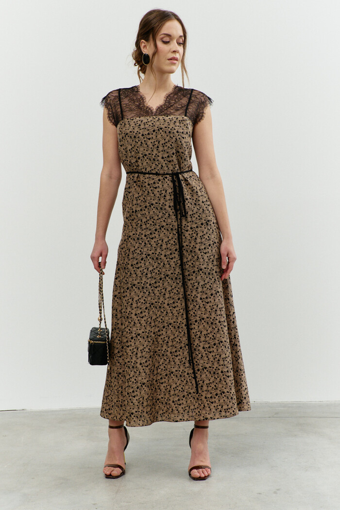 Платье в стиле smart casuaI выполнено из платьево-блузочной тафты. Модель полуприлегающего силуэта со спущенной линией плеча. На передней части застрочены глубокие складки из которых выходит пояс из основной ткани завязывающийся на бант. По спинке широкая эластичная лента. V-образная горловина. Рукава свободные, длины 7/8. Для удобства в носке в боковых швах предусмотрены карманы и разрезы. Длина изделия по спинке 130см; длина рукава (от горловины) 62см.
