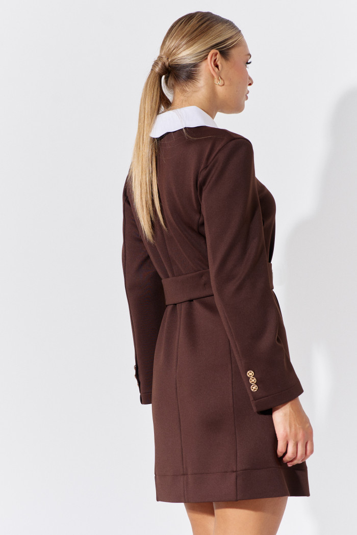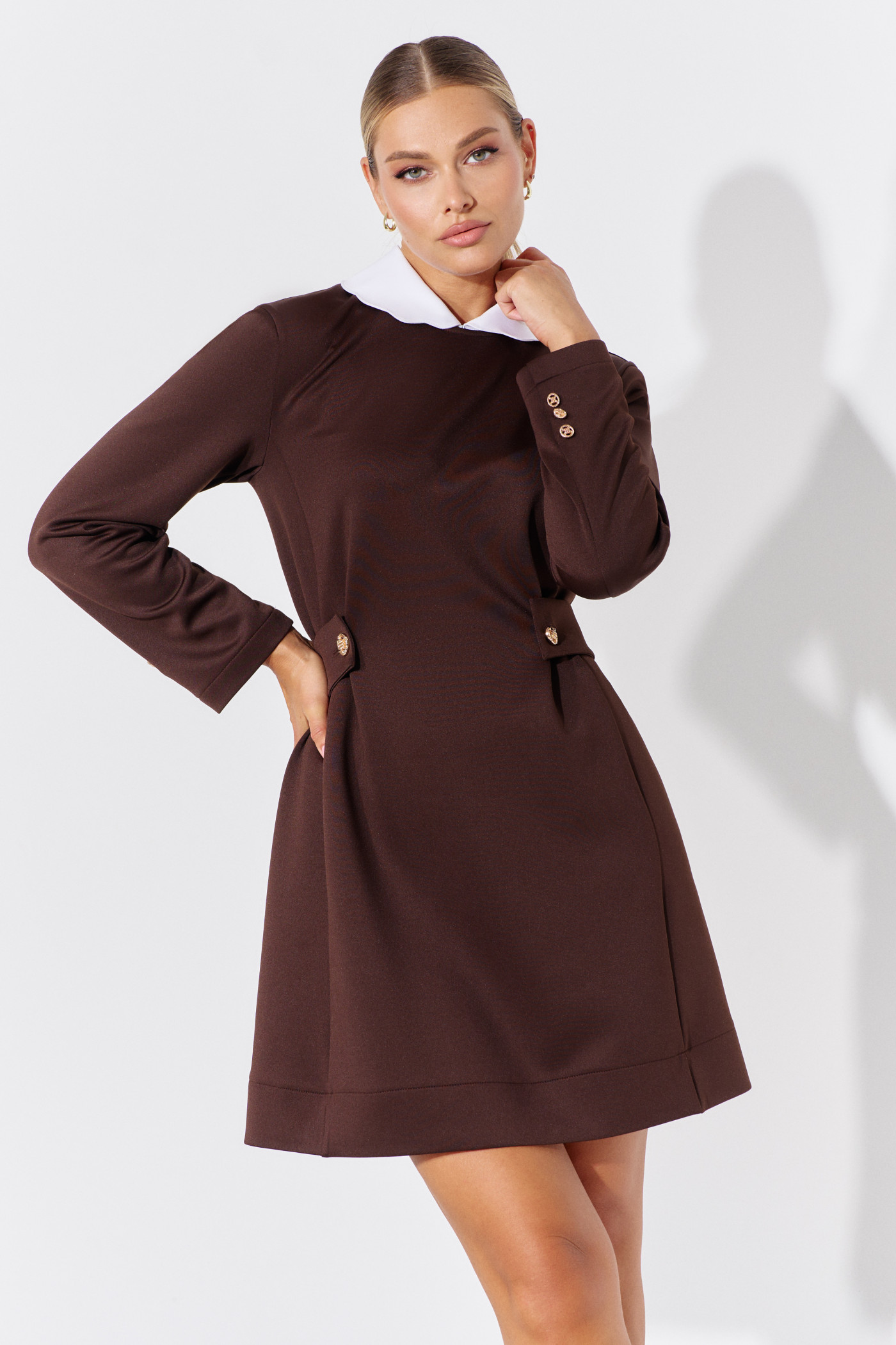 Платье выполнено из плотного трикотажного полотна. Модель женственного силуэта "песочные часы", создаваемого за счёт застроченных по линии талии складок и рельефов, с декоративным поясом, застёгивающимся на складках переда на пуговицы. Для удобства в носке в среднем шве спинки застёжка на кроткую потайную "молнию". Рукава длинные втачные со шлицей на петли пуговицы. Особый стиль изделию придаёт съёмный, отложной воротник фантазийной формы. Длина изделия 85 см; длина рукава 59 см.