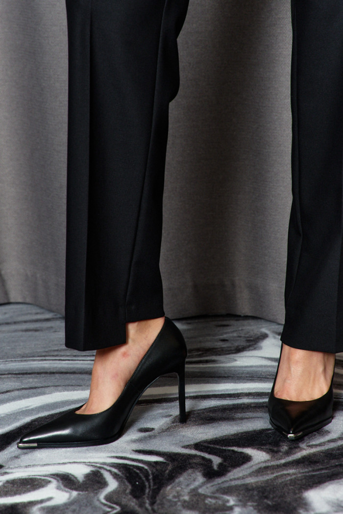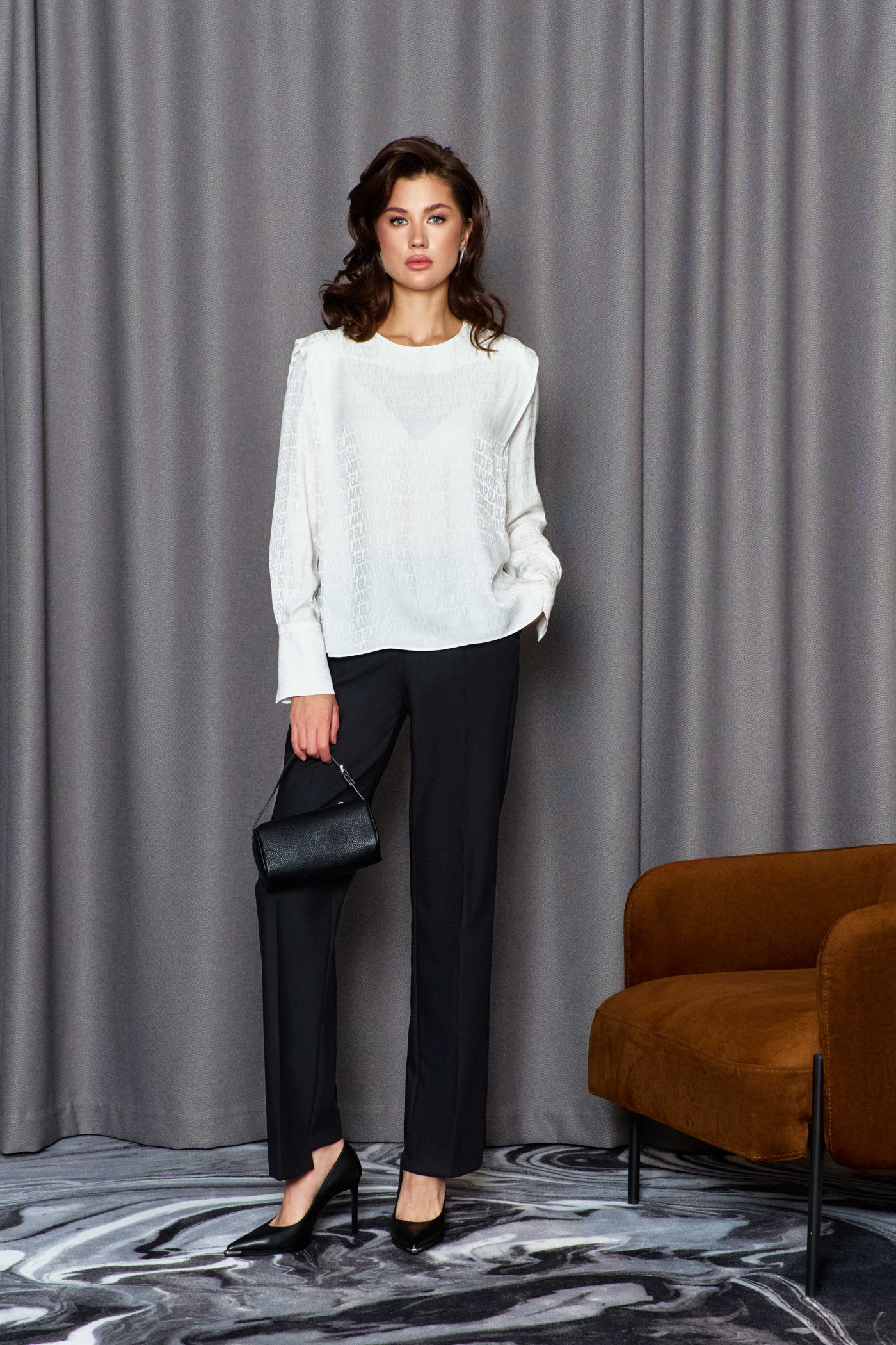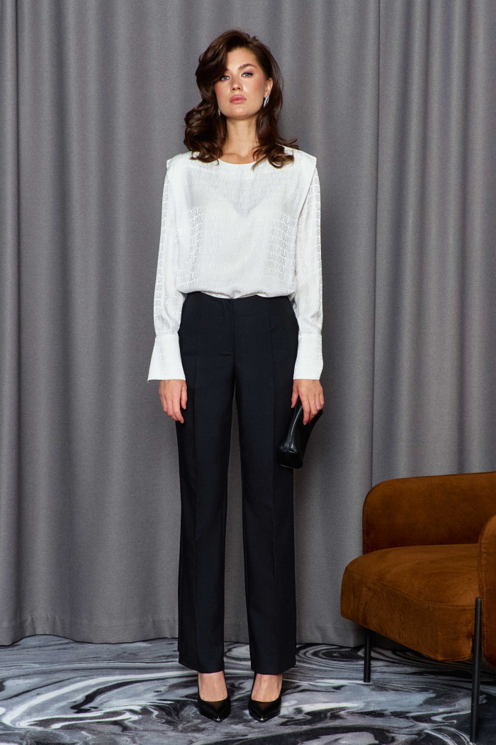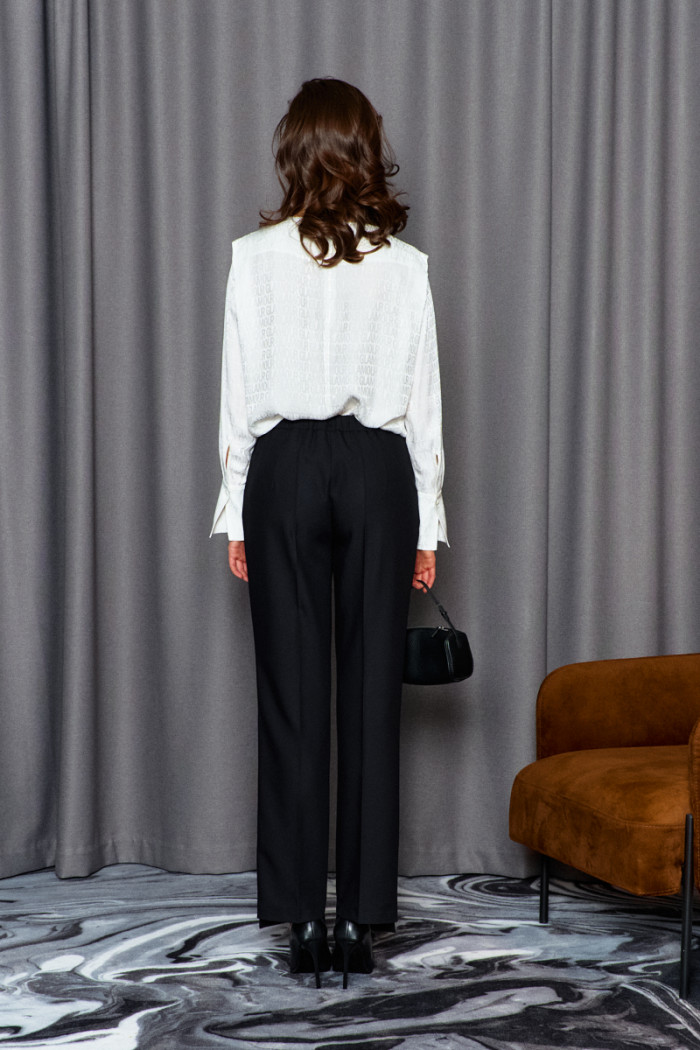 Прямые брюки выполнены из костюмного полотна. Модель полуприлегающего силуэта с цельнокроеным поясом по переду и притачным по спинке с эластичной тесьмой между слоями, застегивающимися на потайной брючный крючок. Для удобства в носке спереди предусмотрены карманы с отрезным бочком и застежка на тесьму «молнию». Особым декоративным элементом является разноуровневый низ (перед длиннее спинки). Длина изделия 108 см.