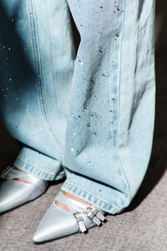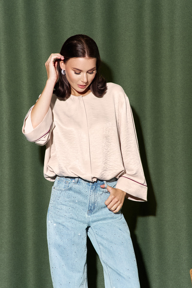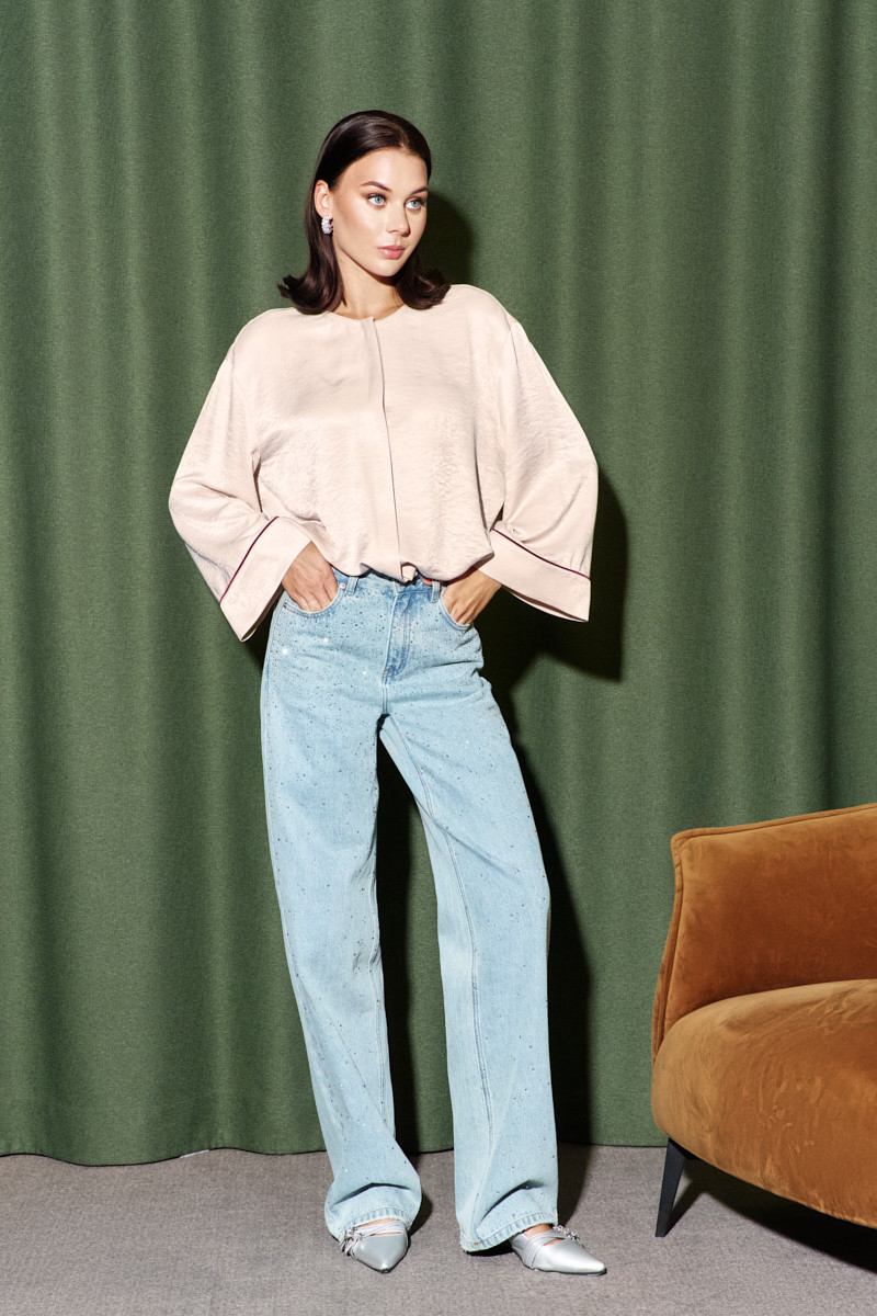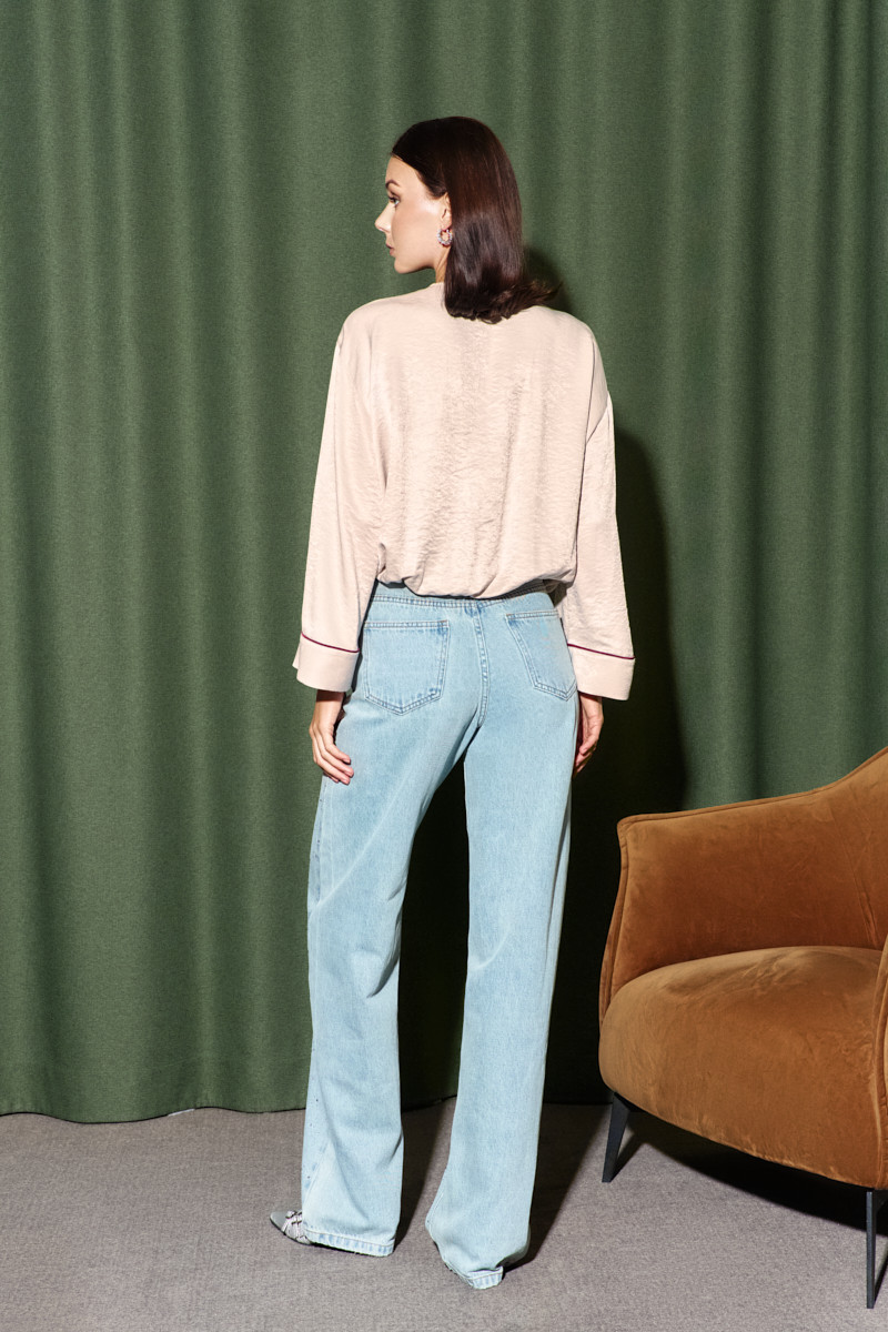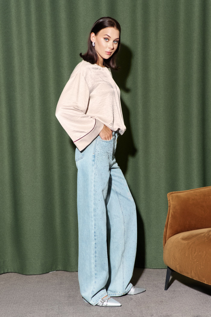 Брюки в стиле smart casual выполнены из хлопкового джинсового полотна. Модель с комфортной высокой посадкой на притачном поясе со шлёвками и застёгивающемся на декоративную пуговицу. Спереди предусмотрены карманы с отрезным бочком и застёжка на "молнию", сзади накладные карманы. Модель декорирована наличием отделочных строчек. Длина изделия по боковому шву (с поясом) 108 см.