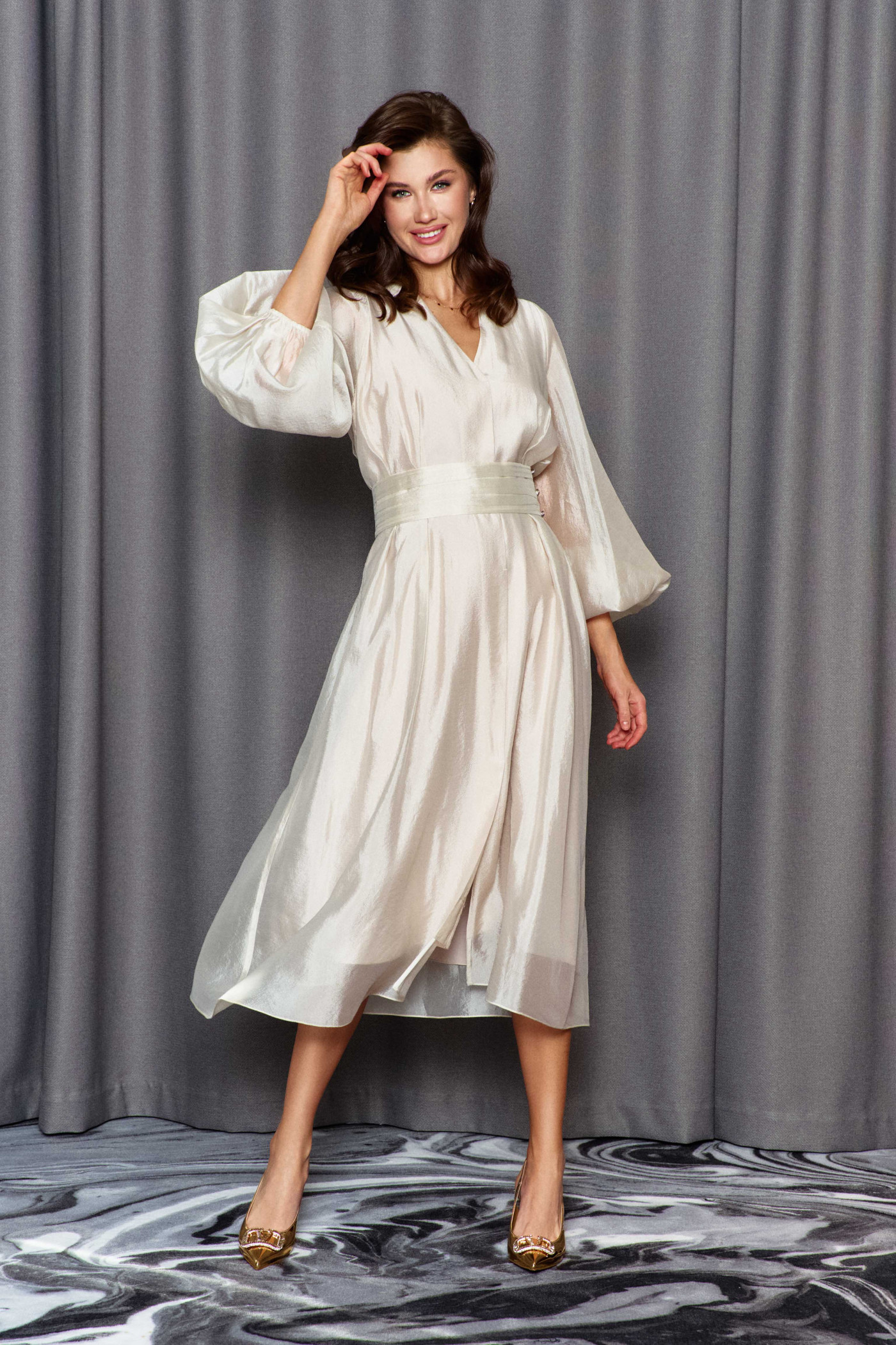 Элегантное платье в стиле City Chic выполнено из полупрозрачной вуали с лёгким блеском. Модель полуприлегающего силуэта, с V-образной горловиной, переходящей в стойку по спинке. Особым декоративным элементом являются встречные складки, заложенные по линии талии на переде и спинке. Рукава реглан длинные, расширенные со сборкой и эластичной тесьмой внизу. Модель комплектуется широким драпированным поясом из основного полотна на навесные петли и пуговицы. Изделие на подкладке из вискозного полотна. Длина изделия 130 см; длина рукава 83 см.