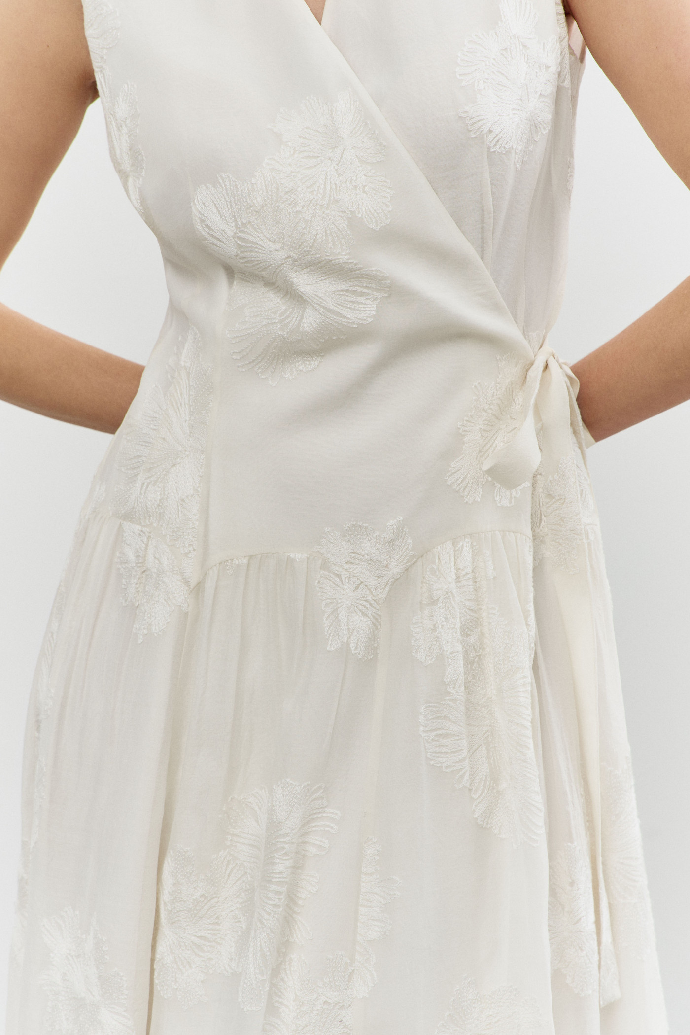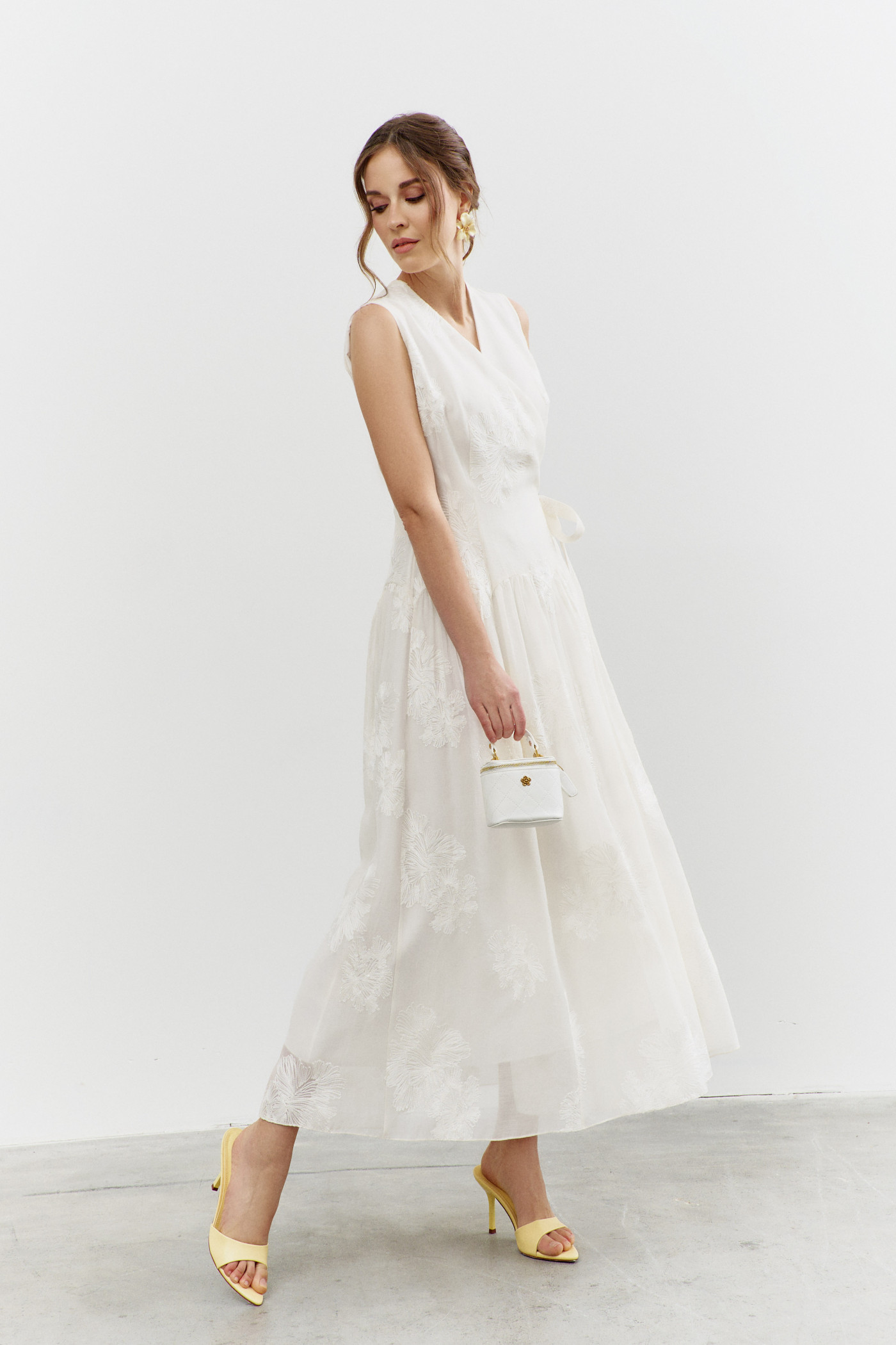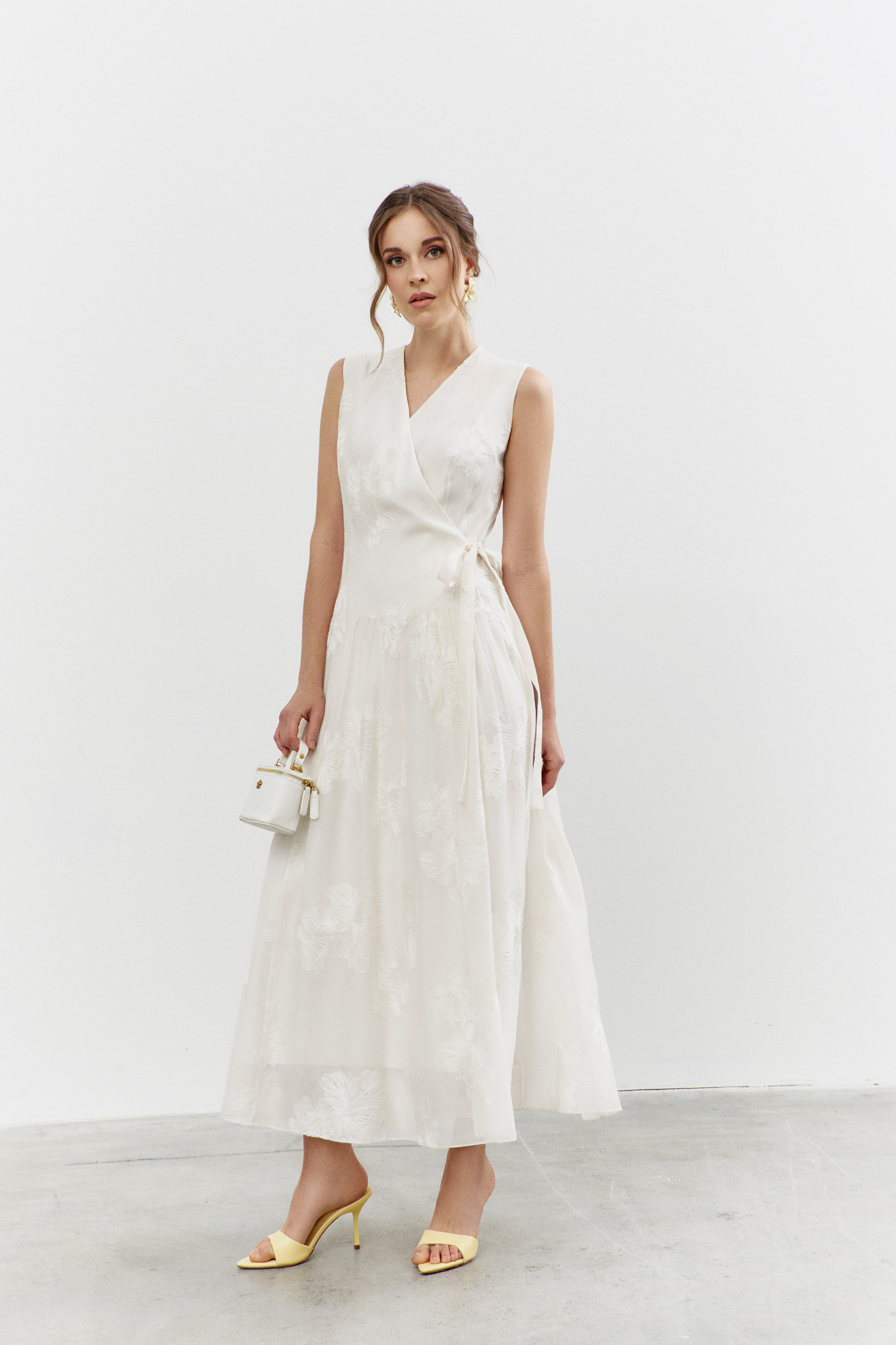 Платье в стиле smart casuaI выполнено из платьево-блузочной тафты. Модель полуприлегающего силуэта со спущенной линией плеча. На передней части застрочены глубокие складки из которых выходит пояс из основной ткани завязывающийся на бант. По спинке широкая эластичная лента. V-образная горловина. Рукава свободные, длины 7/8. Для удобства в носке в боковых швах предусмотрены карманы и разрезы. Длина изделия по спинке 130см; длина рукава (от горловины) 62см.