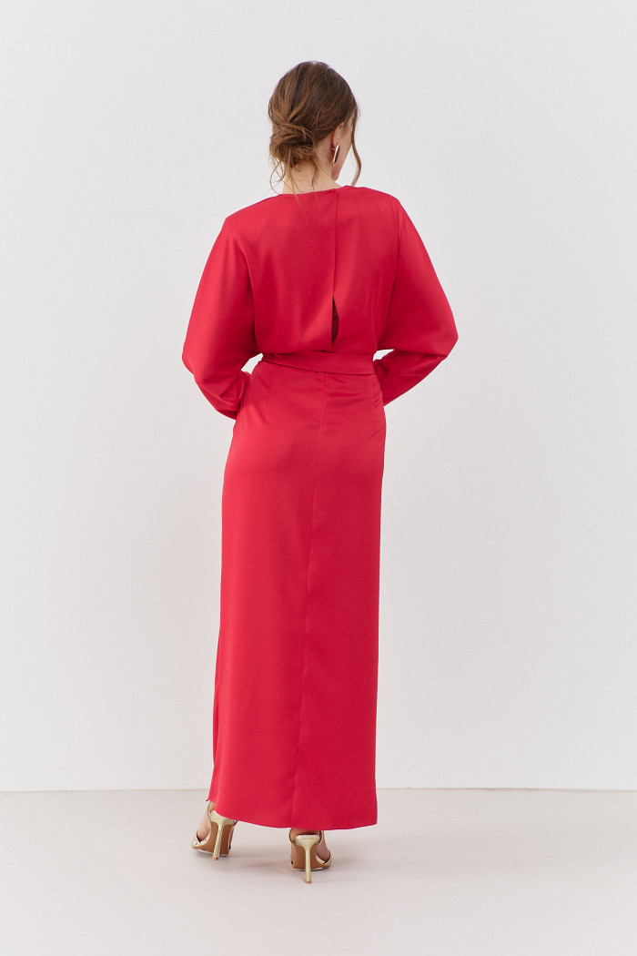 Элегантное платье в стиле city chic выполнено из струящегося сатинового полотна с благородным блеском. Модель полуприлегающего силуэта с цельнокроеными длинными рукавами. V-образная горловина, переходящая в красивый узел по линии талии, формируя мягкую драпировку спереди и образуя эффект запаха внизу по юбке, в котором обработан разрез. Лиф спинки на запах с застёжкой на пришивные кнопки, а в среднем шве юбки — короткая потайная «молния». Для удобства в носке в шве соединения юбки с лифом предусмотрен пояс с эластичной тесьмой между слоями. Низ платья на подкладке из вискозного полотна. К платью прилагается съёмный пояс из основного полотна на петли и с декоративными пуговицами. Длина изделия — 146 см; длина рукава (от горловины) — 75 см.