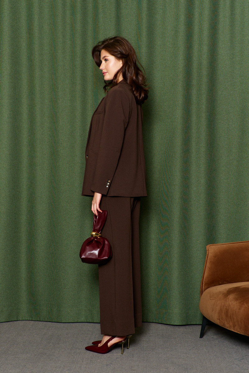 Двубортный классический жакет на подкладке, выполнен из костюмного полотна. Модель прямого силуэта с лацканами пиджачного типа и длинными рукавами со шлицей. Для удобства в носке спереди предусмотрены прорезные карманы «в рамку». Левая часть переда дополнена декоративной нагрудной листочкой. В среднем шве спинки шлица. Длина изделия 70 см; длина рукава 58 см.